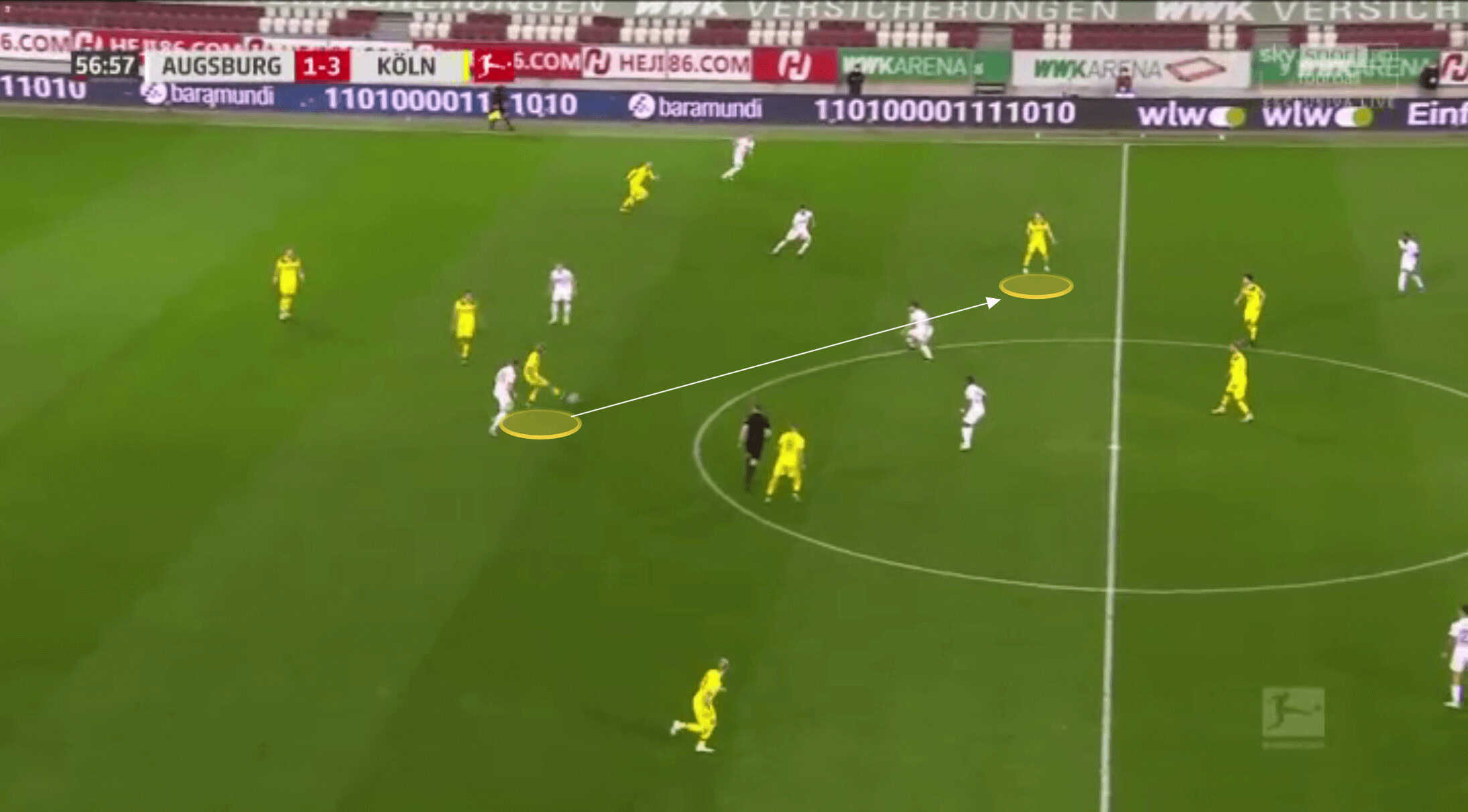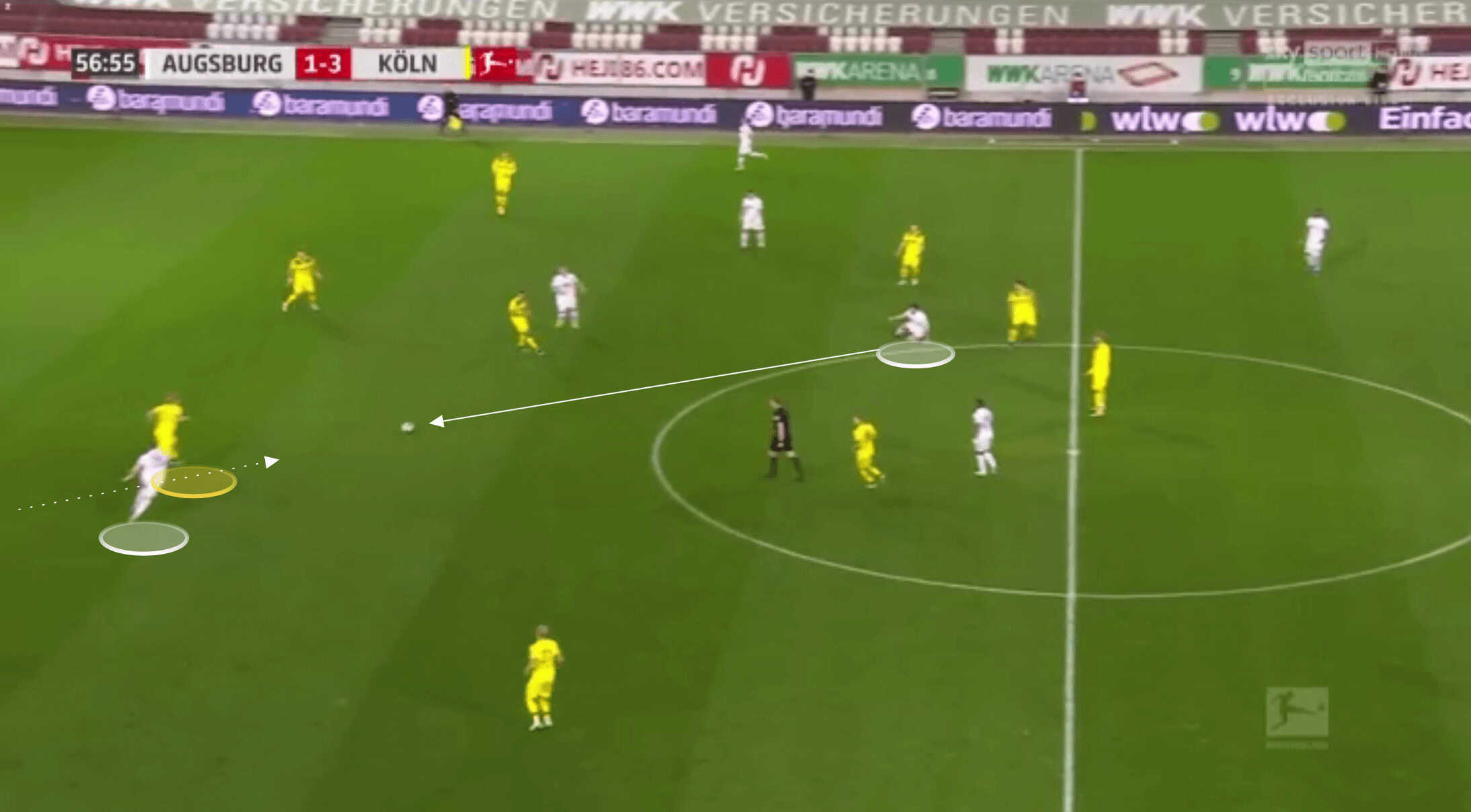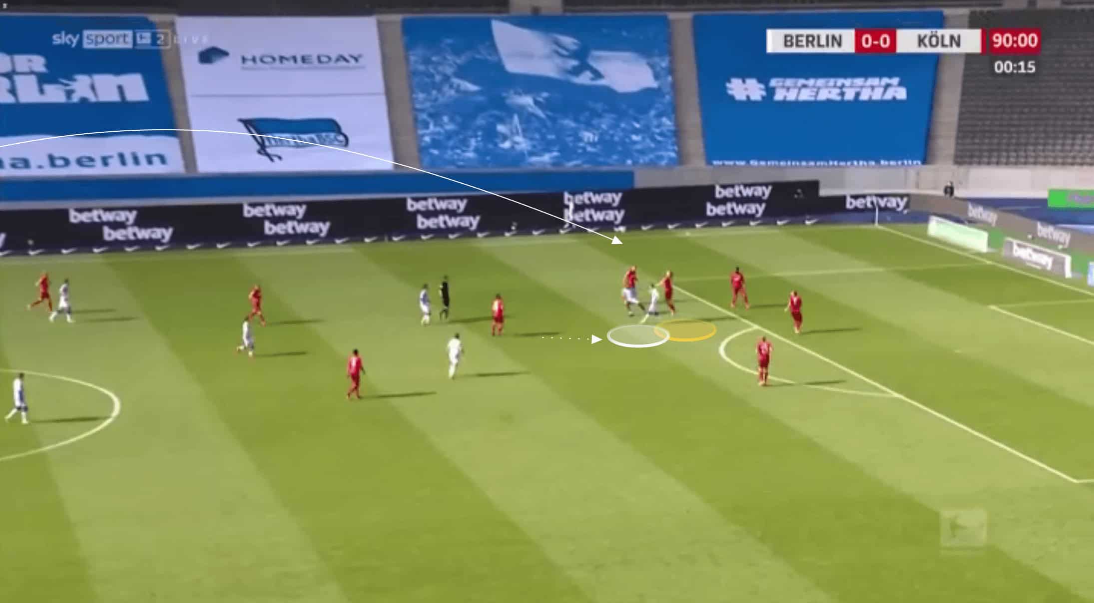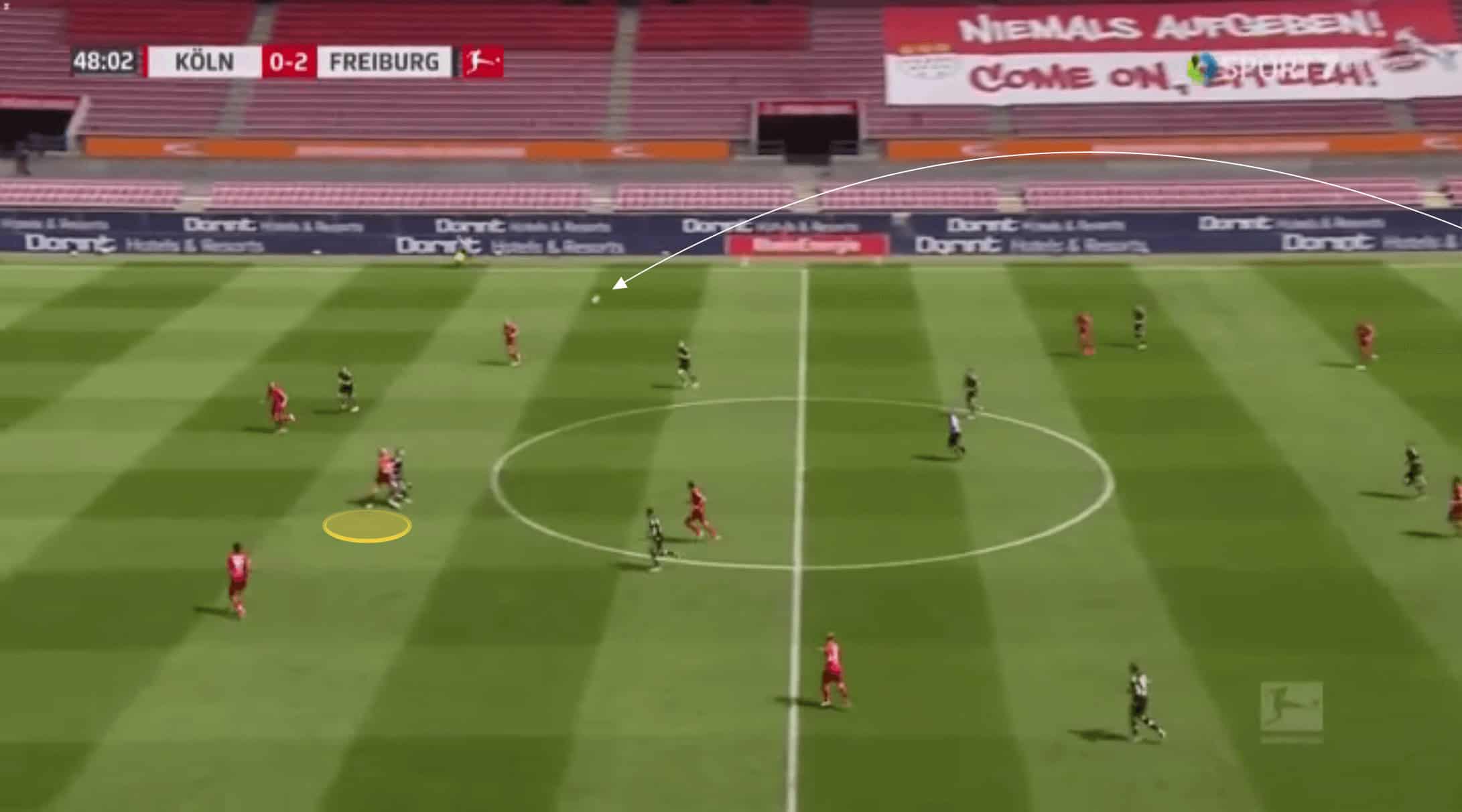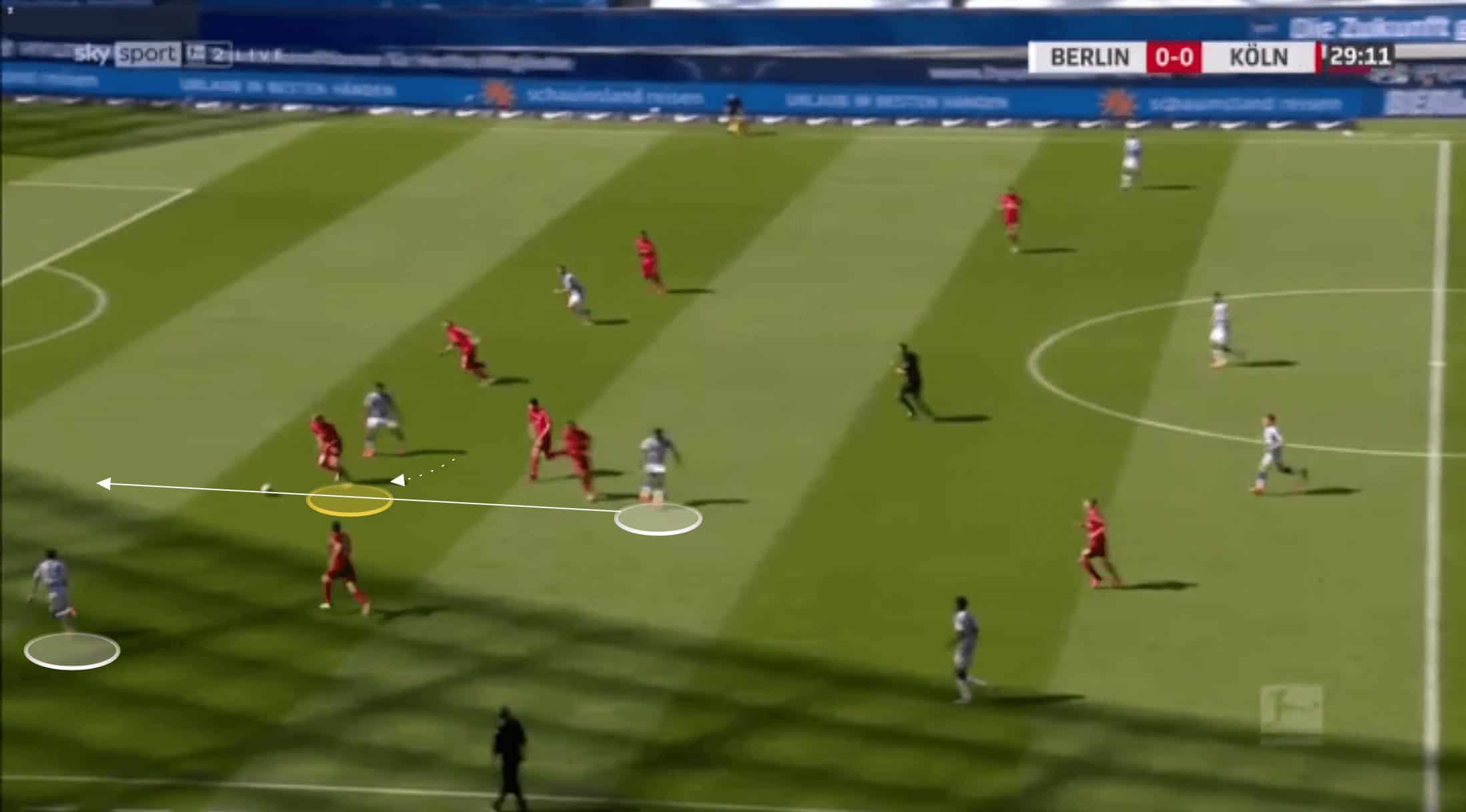 Below, the pass is played through Koln’s midfield, and Bornauw is the closest goal-side defender.