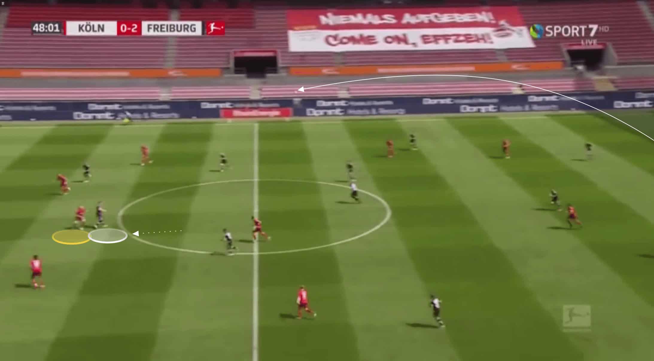 By delaying the attack here, he allows his midfield to recover and thwarts Freiburg’s quick break.