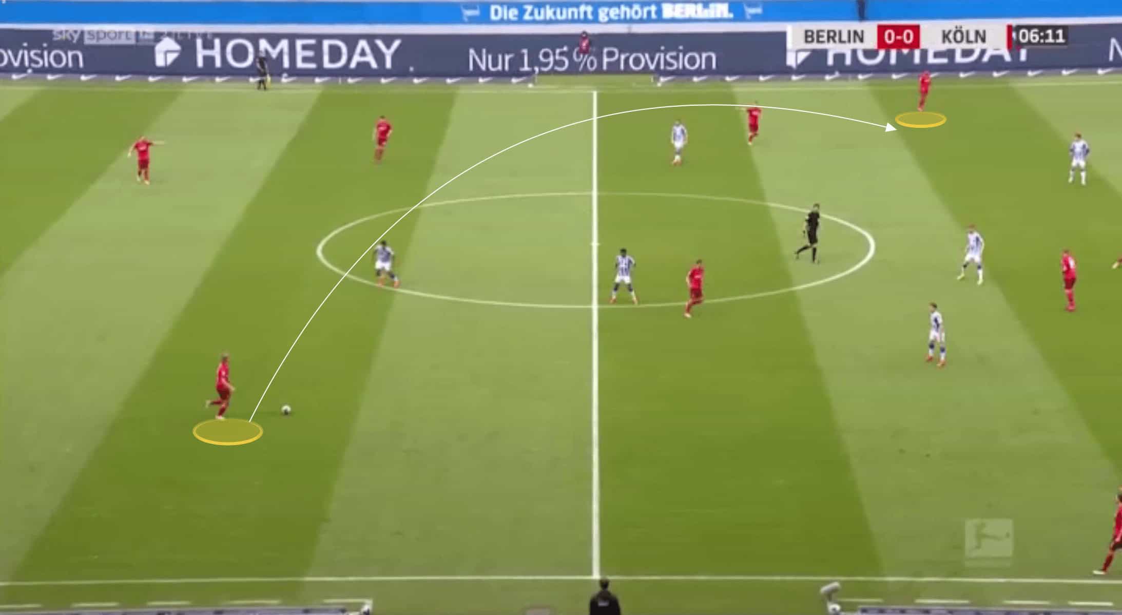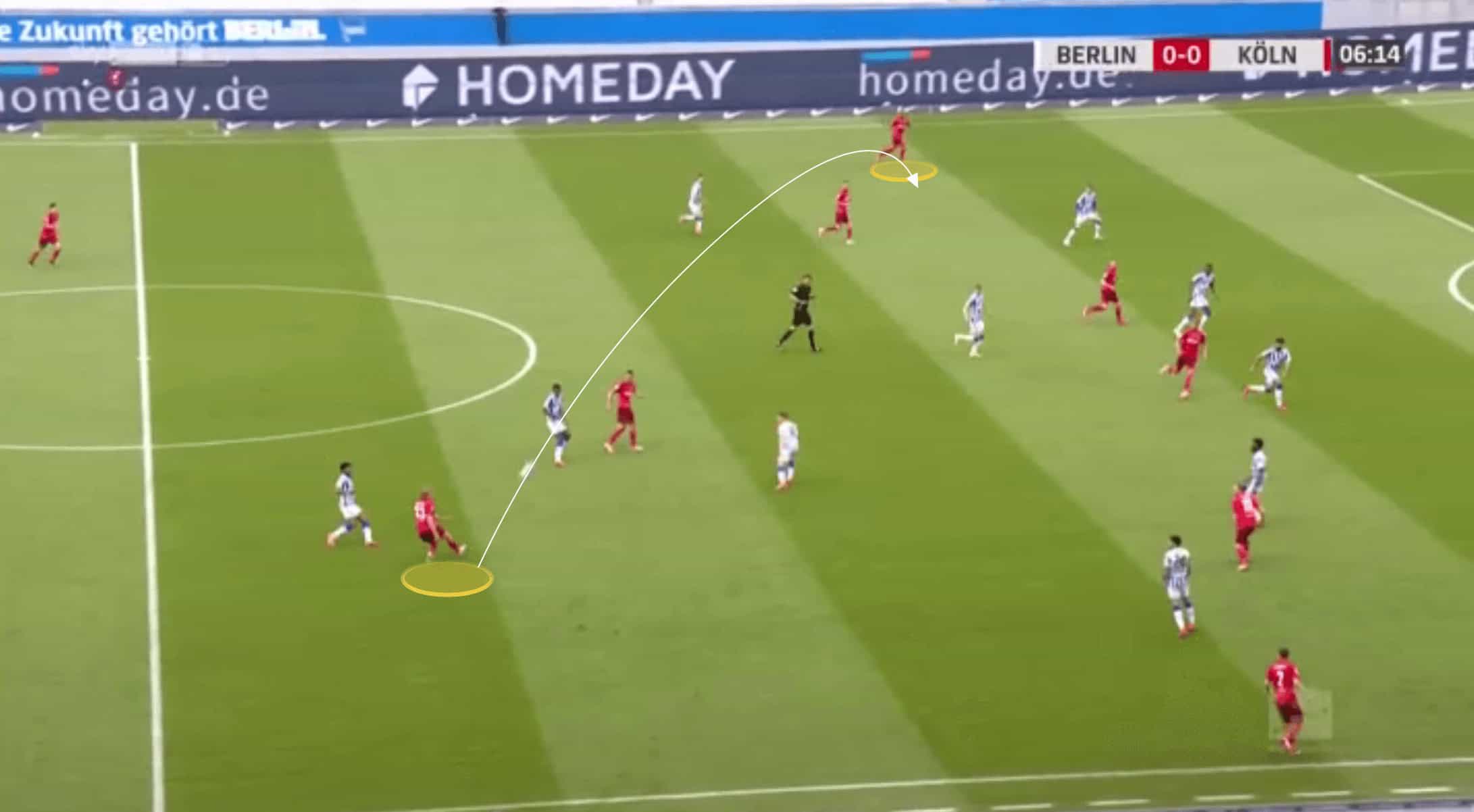 Generally speaking, he will play as a right-sided centre-back though, and while Koln predominantly played with a back four, as we can see in the image below Koln also used a back five on a number of occasions.