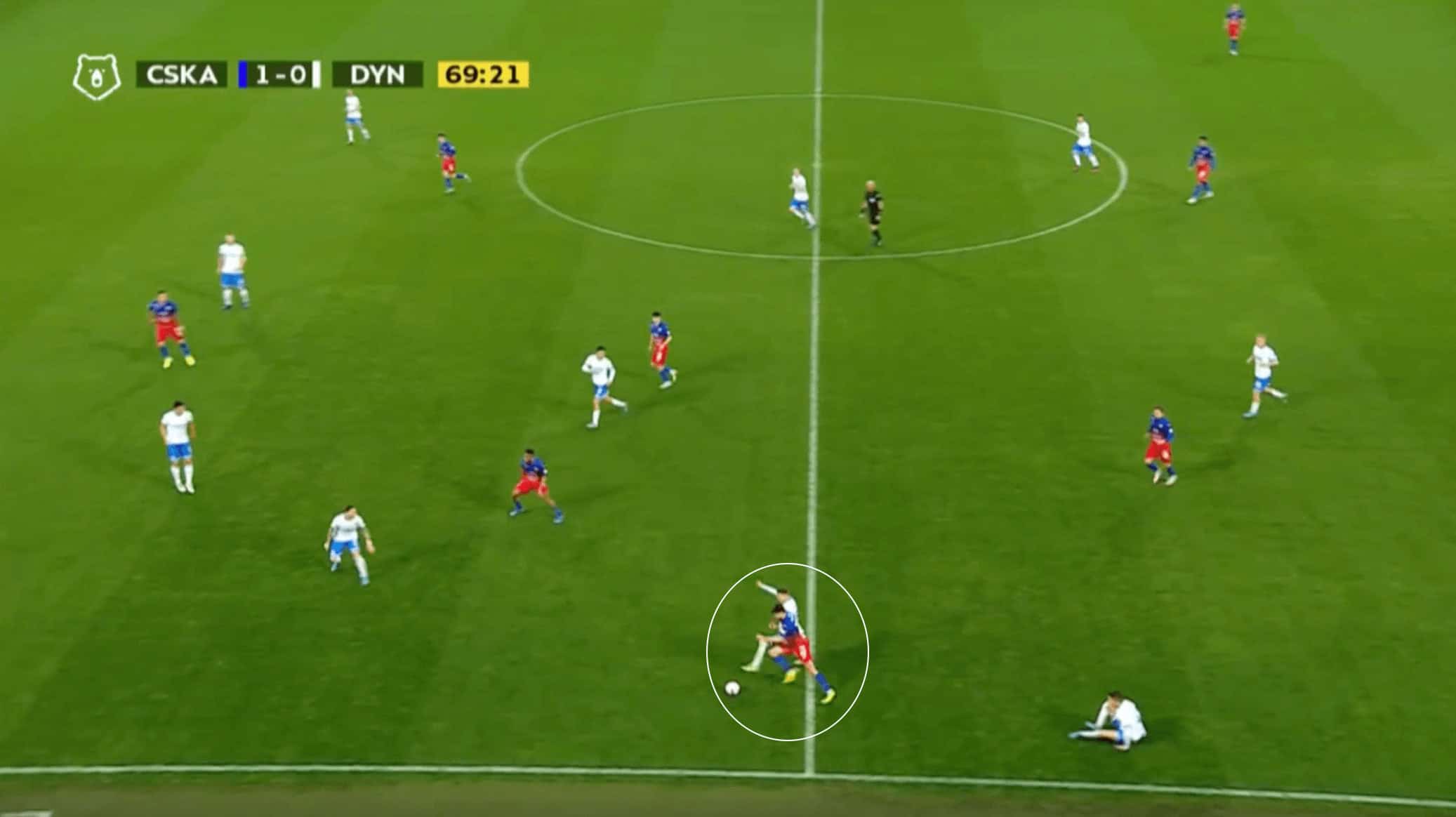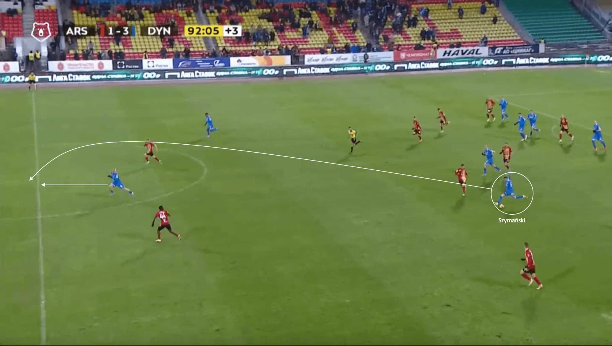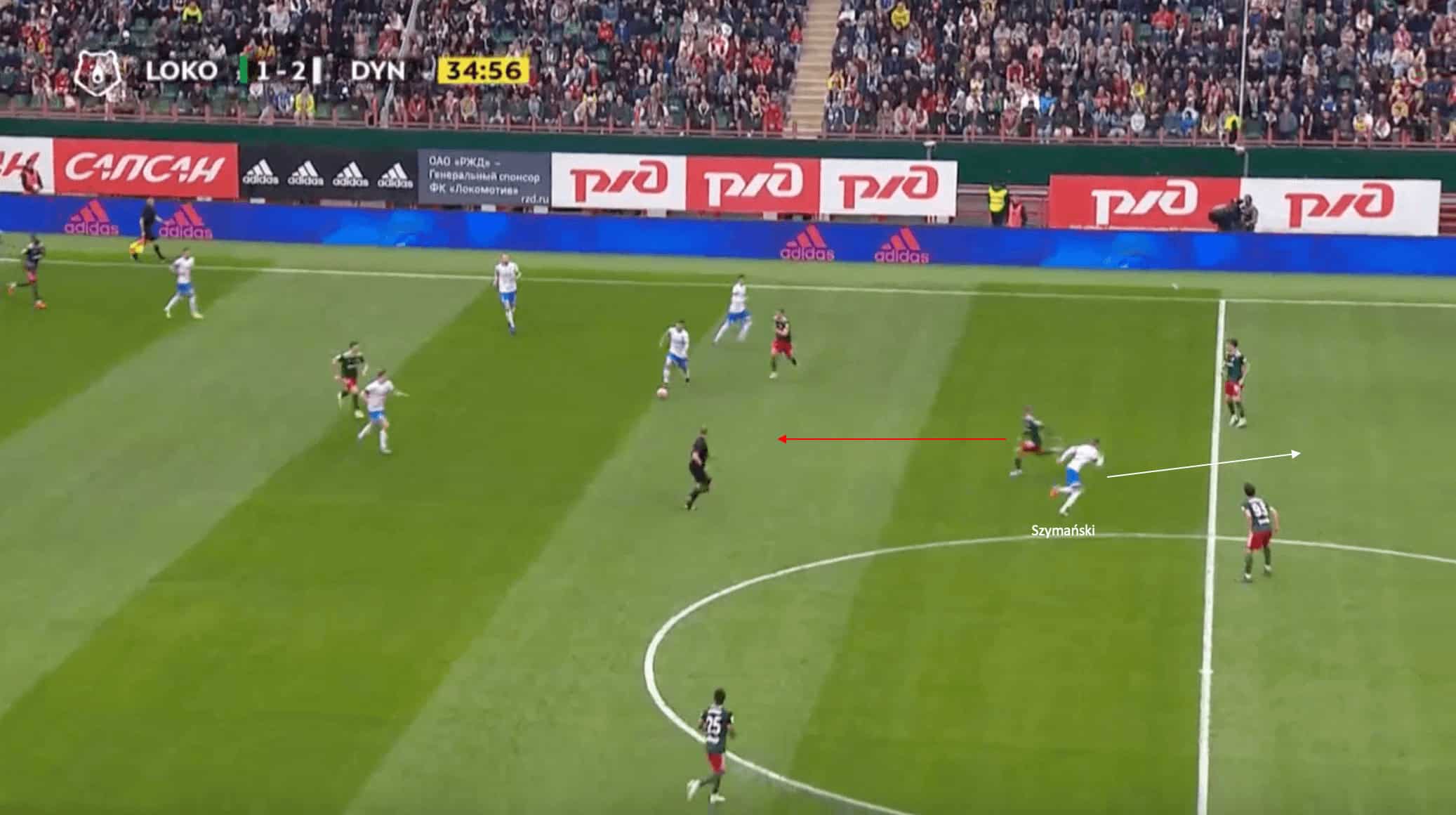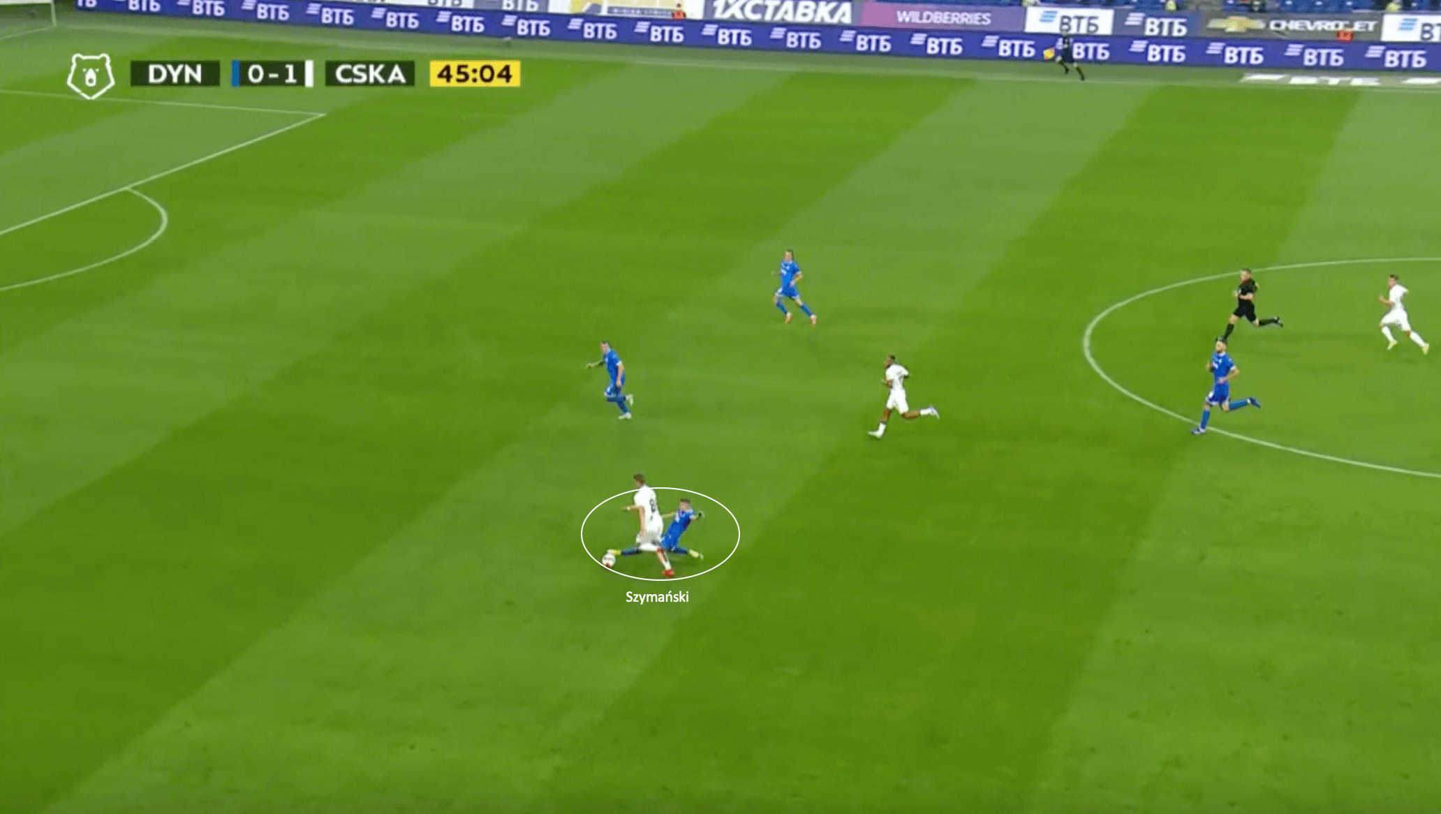 The image above shows an example of the strength that Szymański also possesses when it comes to the defensive side of his game. With the CSKA Moscow player in possession on the touchline, Szymański tracks back and goes into the challenge shoulder-to-shoulder with the attacker. He is able to use his superior strength to win the ball off the opposition player fairly, which allows the Polish midfielder to then start a counter-attacking sequence for Dynamo Moscow near the midfield area.