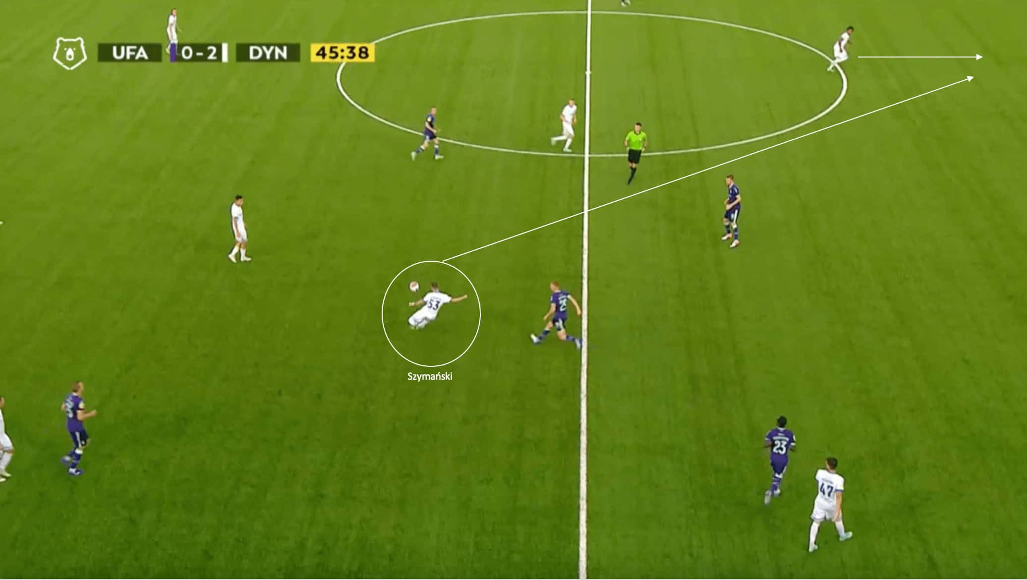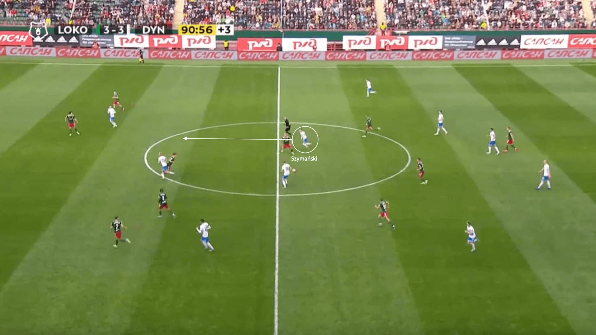 The image above shows another example of Szymański’s ability to pick out teammates. In the phase of play above, Dynamo Moscow looked to counterattack quickly after an opposition free kick. Szymański noticed the run of the player through the middle and played the ball at the correct time to prevent the attacker from being offside. The ensuing ball from the midfielder is perfectly played into the forward’s path, with him able to run onto it before being 1v1 against the goalkeeper and scoring.