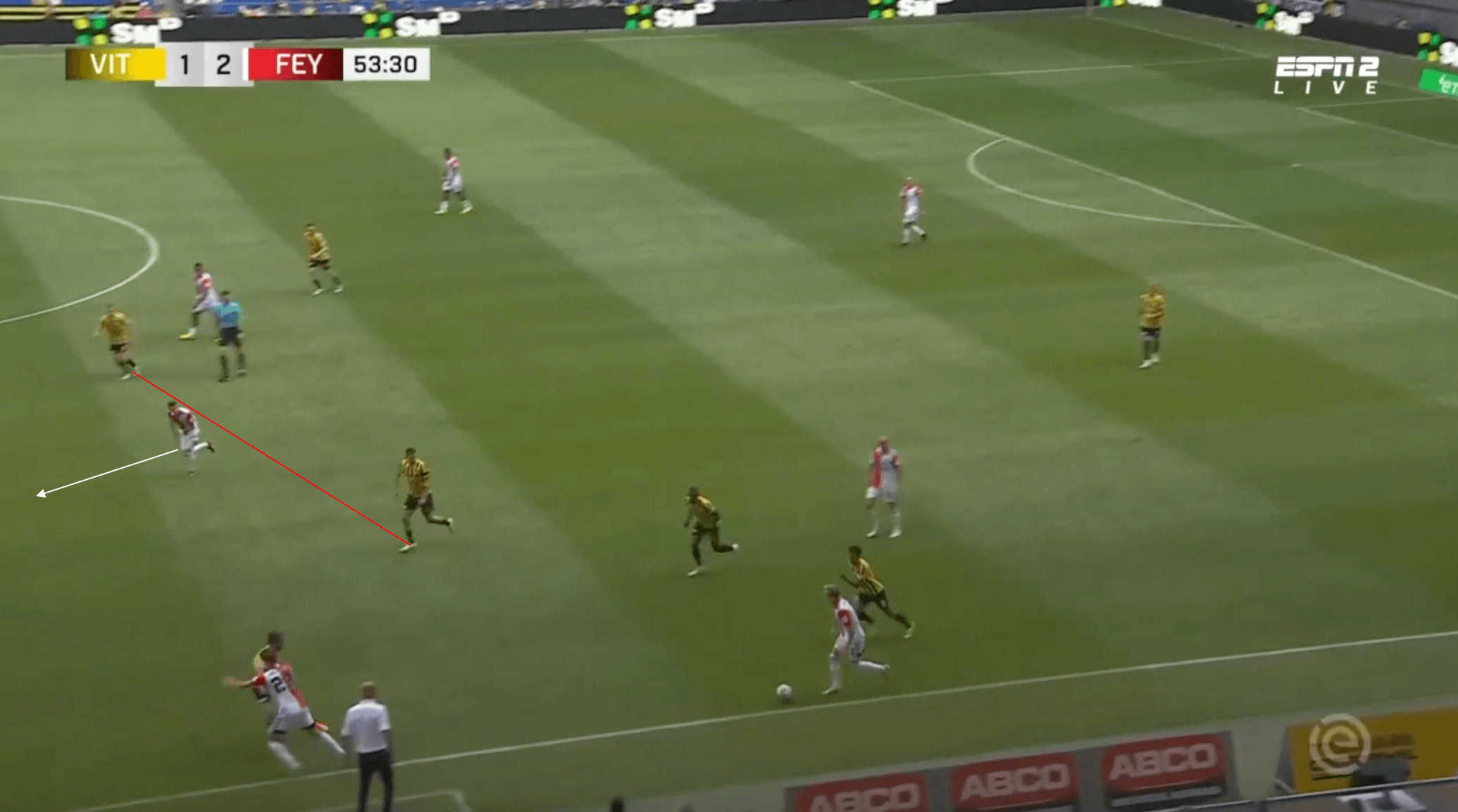 This final example is actually from Szymański’s first game for Feyenoord this season, but the same trends appear. The midfielder is able to notice the space between the two closest Vitesse defenders and runs through them, making himself an unmarked passing option in an advanced position. While the ball to him is overhit, it still shows the lengths that Szymański will go to in order to become an advanced passing option for his teammates.