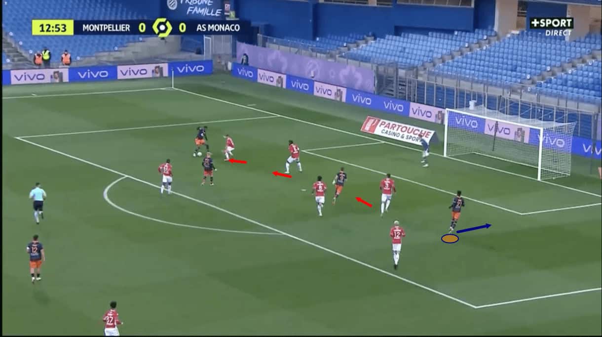 This leads to the right centre-back shifting over to provide cover behind that full-back, creating space for a Montpellier attacker to invade the space opening between the centre-backs. This then leads to the opposition’s left centre-back getting dragged towards that attacker, creating space for Wahi behind that defender on the blind side at the back post.