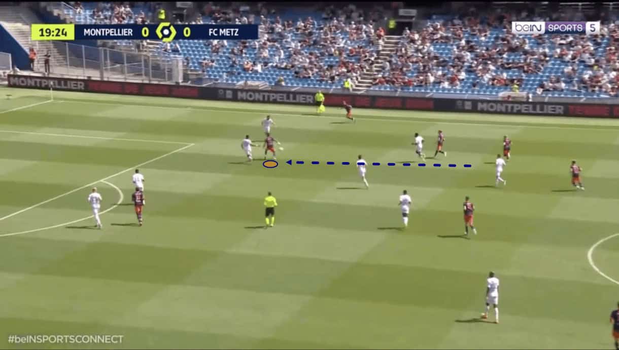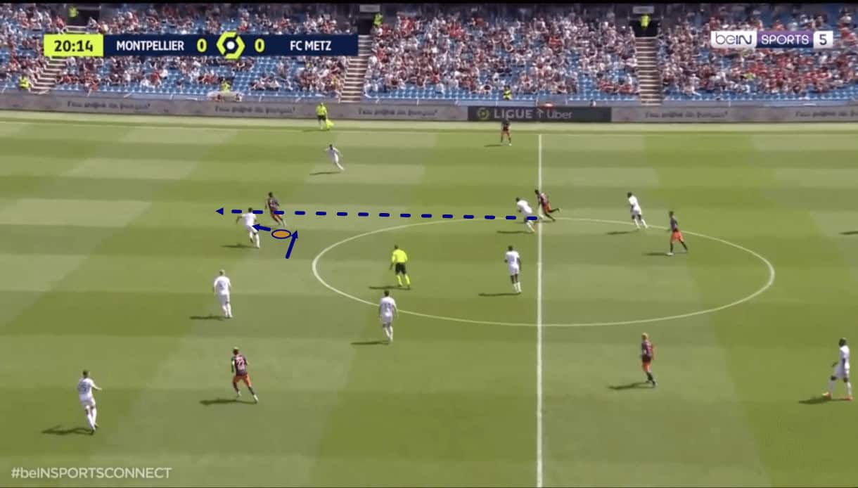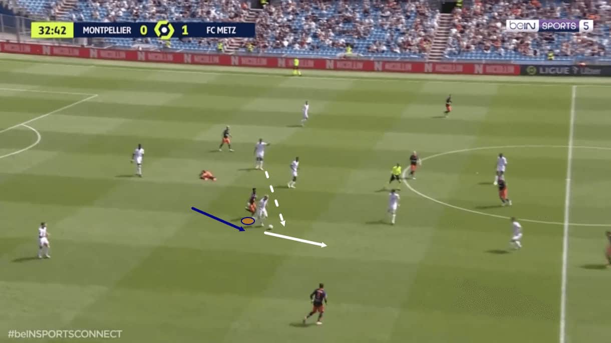 From here, the 19-year-old maintains this distance from the defender, allowing himself to enjoy plenty of space and actually double-up on the defender behind him in figure 2, with the attacker already occupying that player. The Montpellier duo make it impossible for the defender to cope with the two attackers via their movement.
