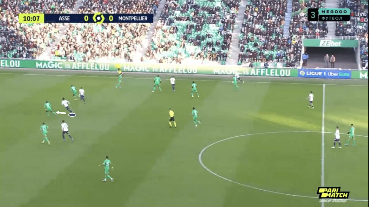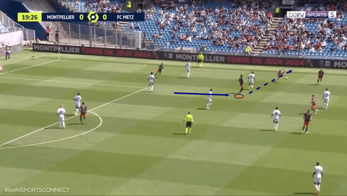 Figure 1 shows an example of Montpellier building from the middle third of the pitch into the final third, with Wahi placed in his preferred centre-forward position in this image, though we’ve seen the right-footed attacker operate from both the wide right and wide left forward positions at times this term.