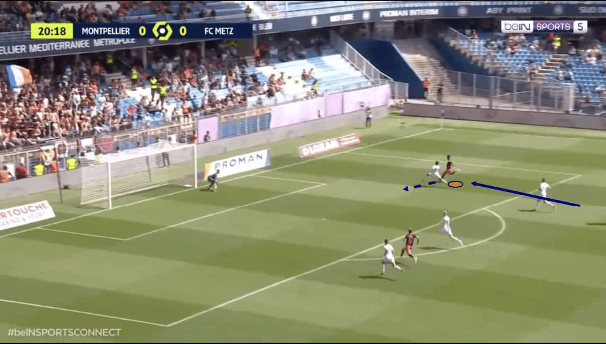 As the ball enters the final third, we see that Montpellier have just broken through Saint-Étienne’s backline with a through ball for the wide man to chase down. Just as that pass is played towards the right wing, Wahi intelligently creates separation between himself and the distracted defender between him and the ball, pulling away with a big step back on the defender’s blind side.