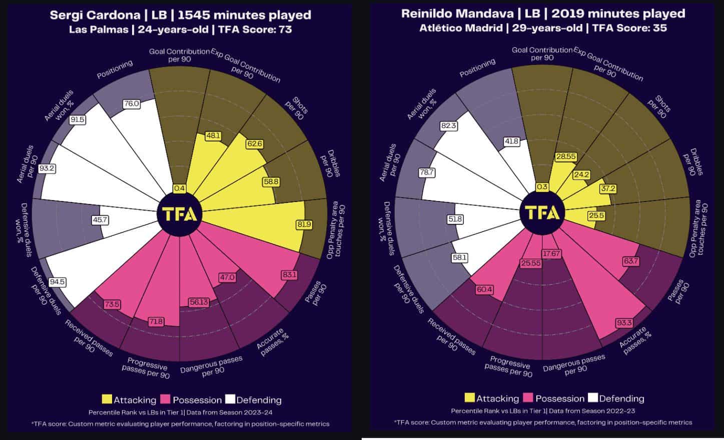 When comparing the two profiles, they would imply that Sergi Cardona could be a useful replacement should Atlético look to move on from Reinildo.