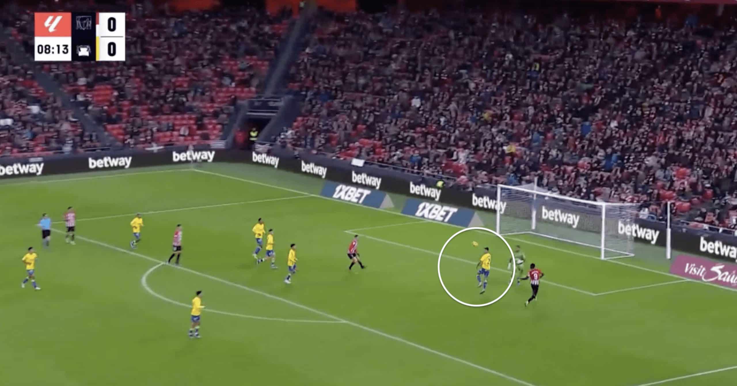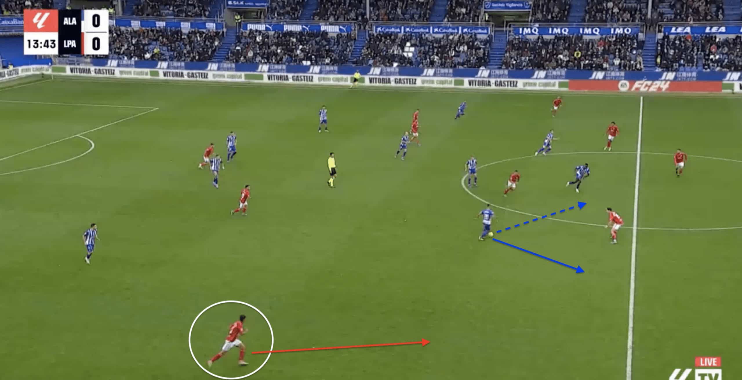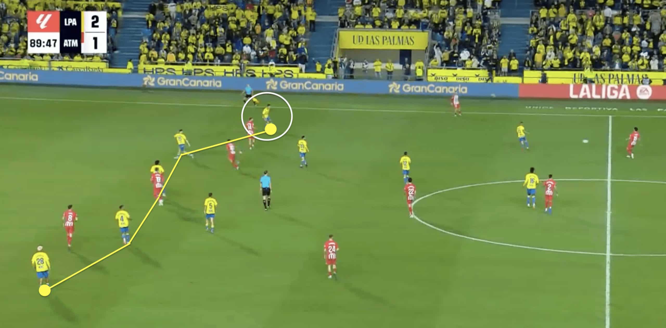 While Las Palmas has succeeded in its proactive pressing style, Cardona can lose focus and overextend in the challenge, allowing wingers to have increased space and freedom.