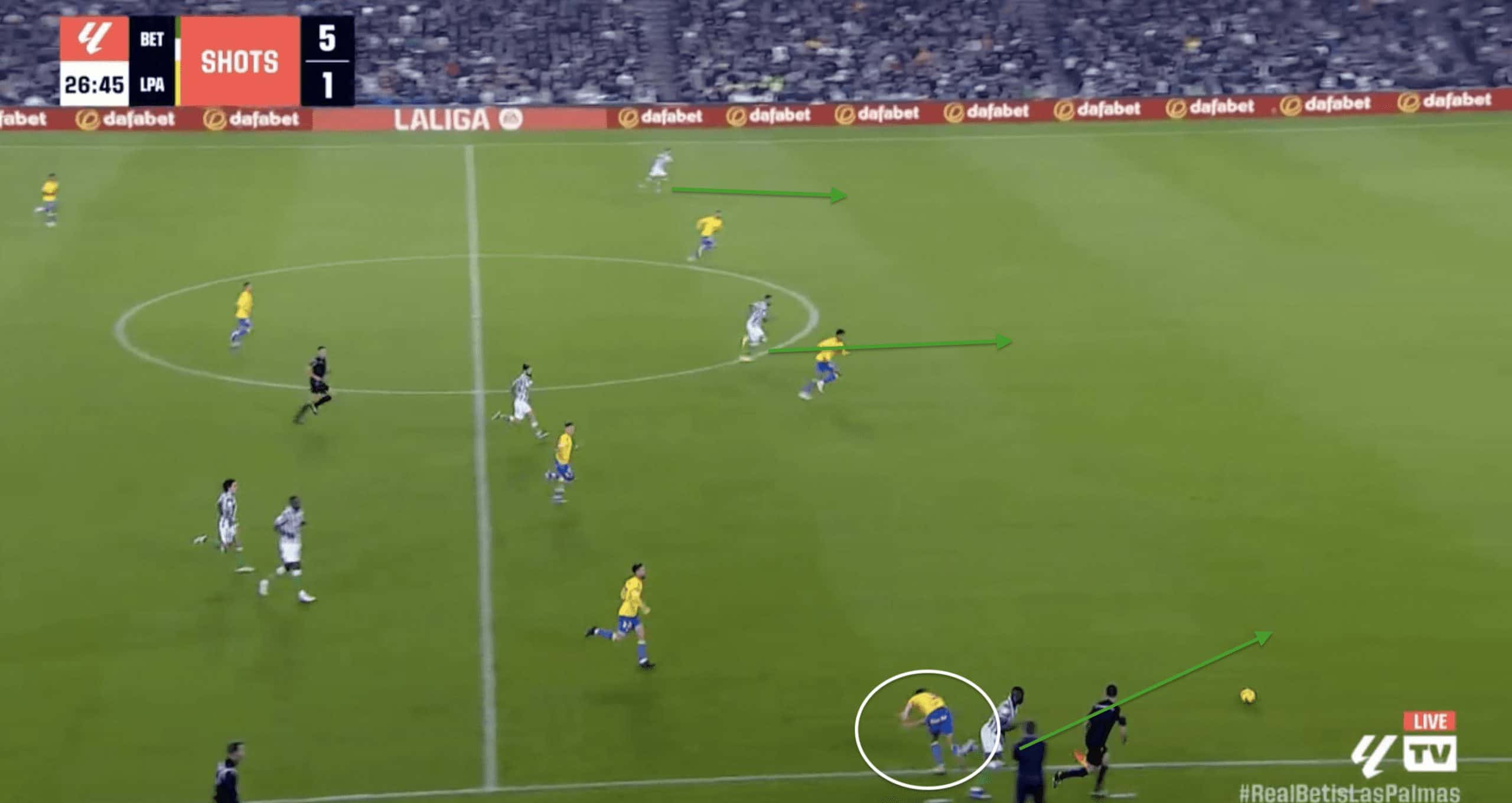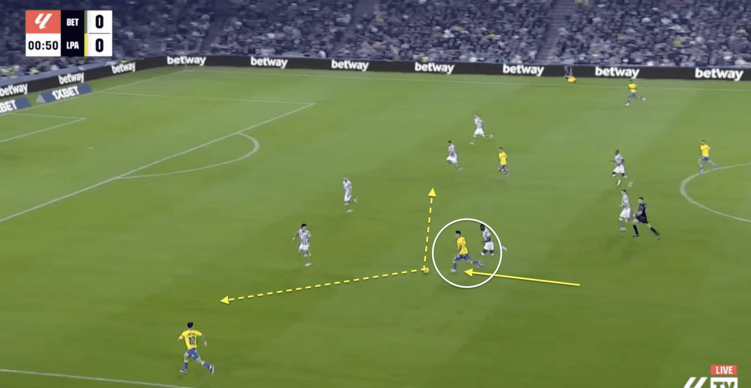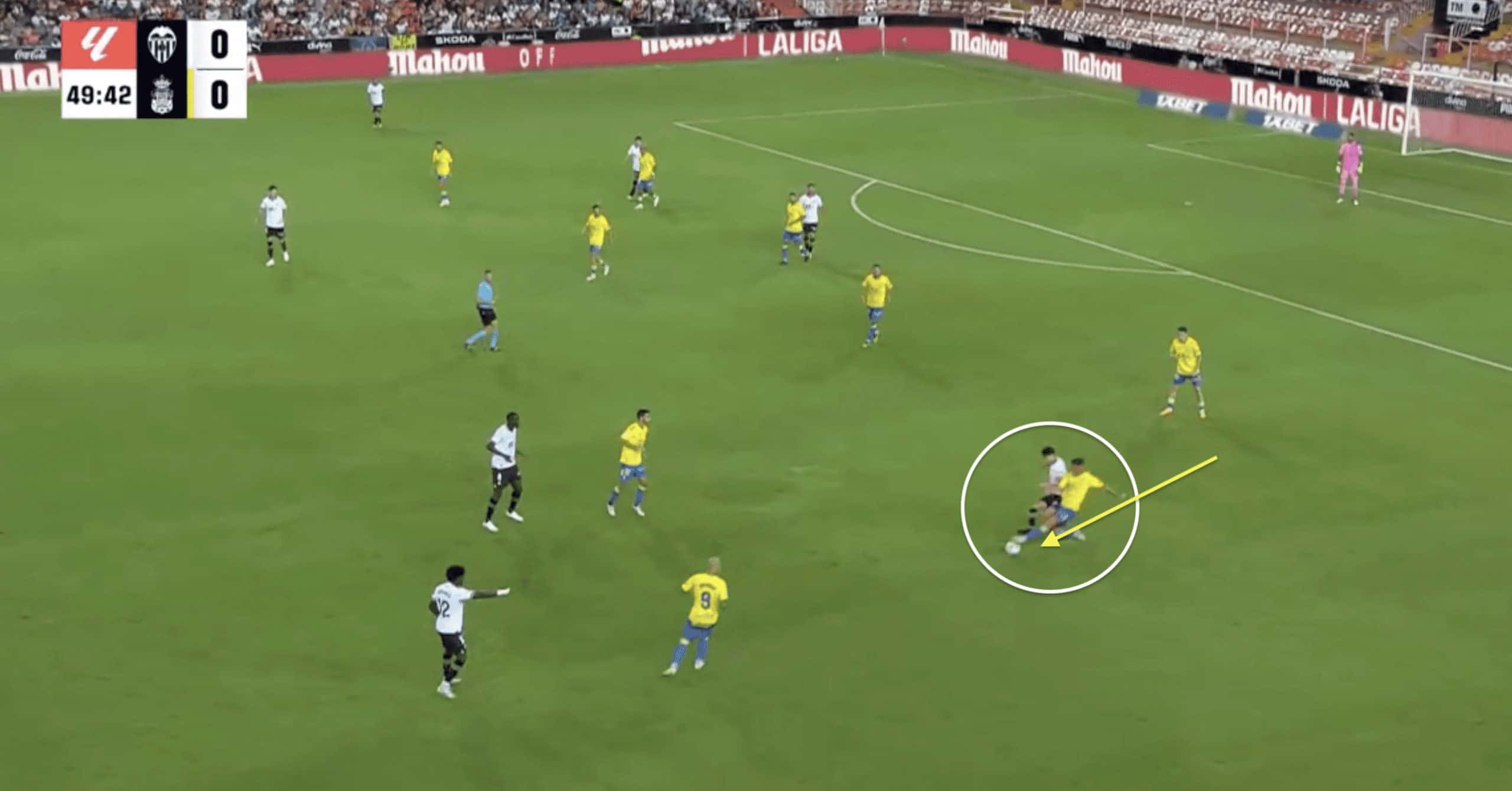 While Las Palmas has succeeded in its proactive pressing style, Cardona can lose focus and overextend in the challenge, allowing wingers to have increased space and freedom.