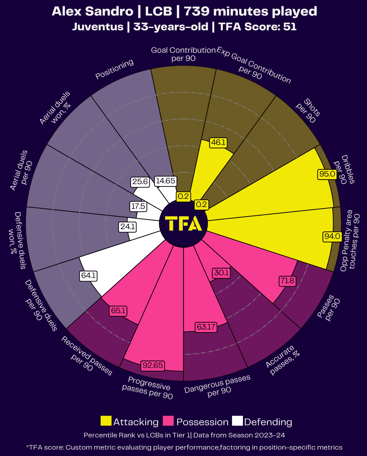 In his 16 Serie A appearances last season, Sandro posted high percentiles for statistics such as dribbles and touches in the opposition box, which gives insight into the kind of ball-playing CB he is.
