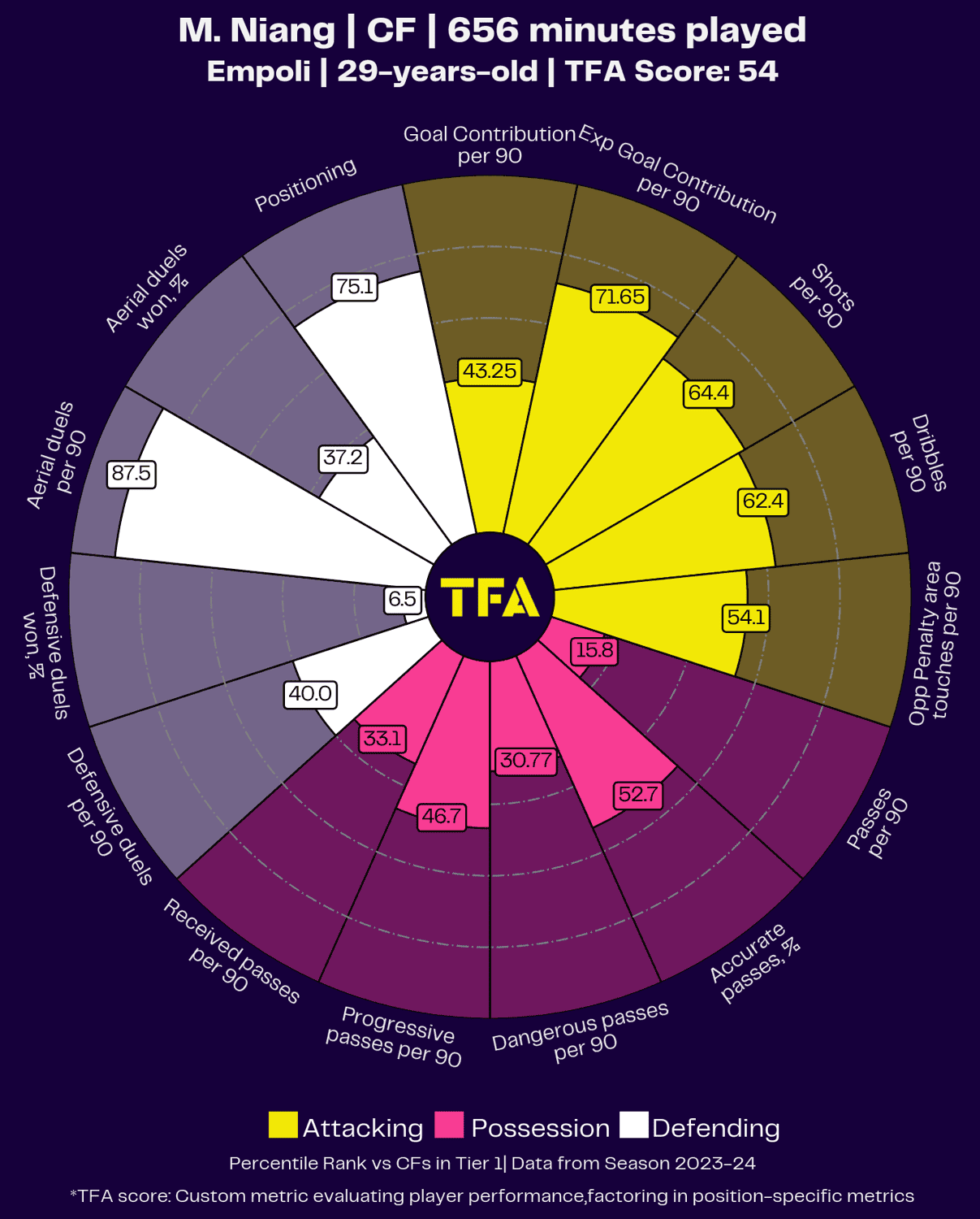 Niang averaged 8.69 aerial duels per 90 last season, the sixth-highest in Serie A, showing just how important that part of the game is to his style of play – a success rate of 31.6% suggests that he possesses the ability to beat opposition defenders in those aerial moments, allowing him to be an important part of a team’s build-up play within certain tactics.