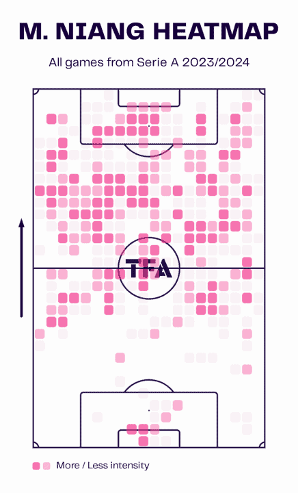 Without seeing him play, you may assume that Niang stays central to offer his aerial and physical presence in build-up play and attack, but as his heatmap shows us, that is not the case.