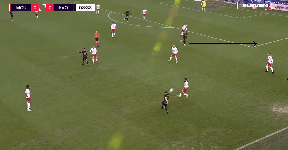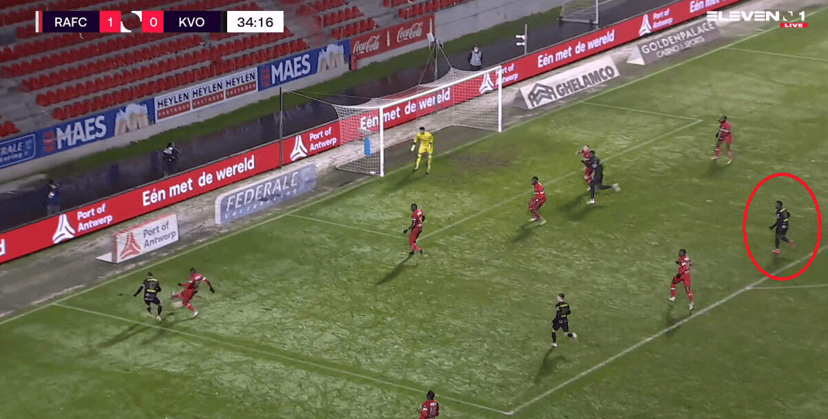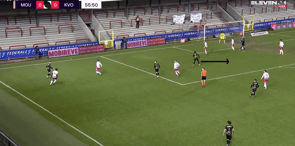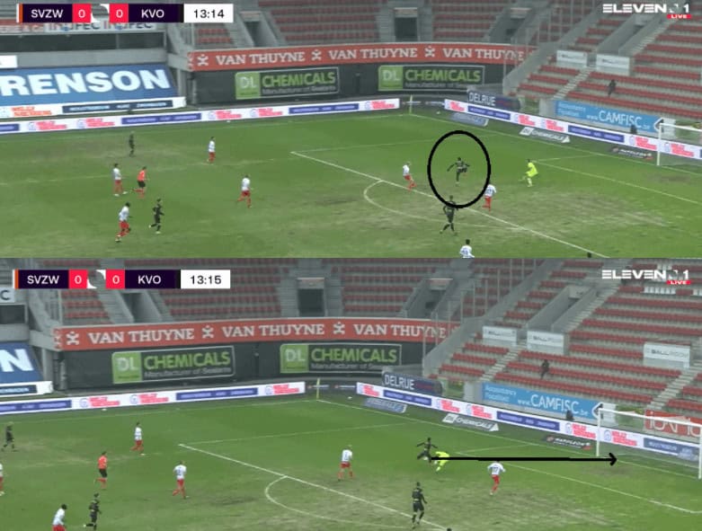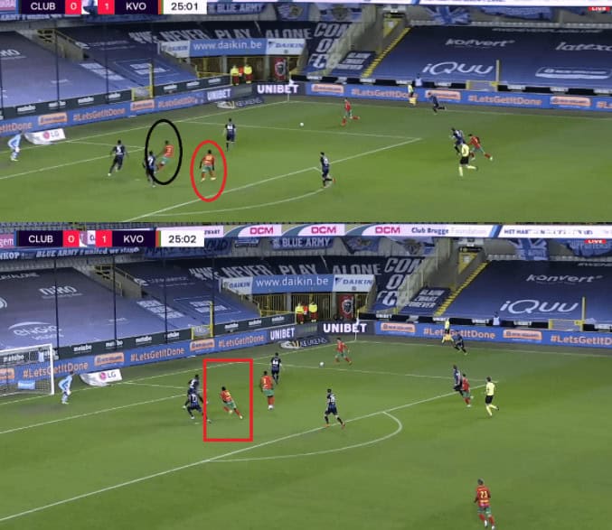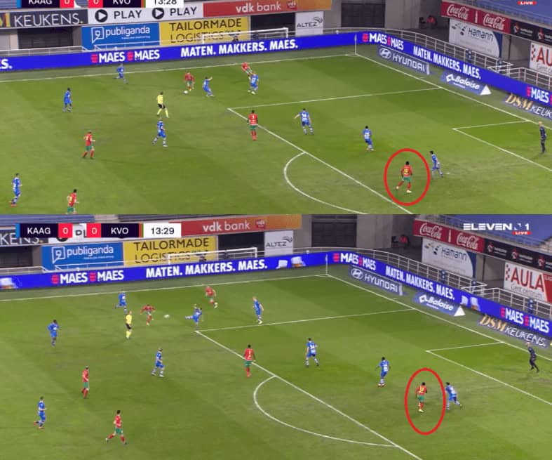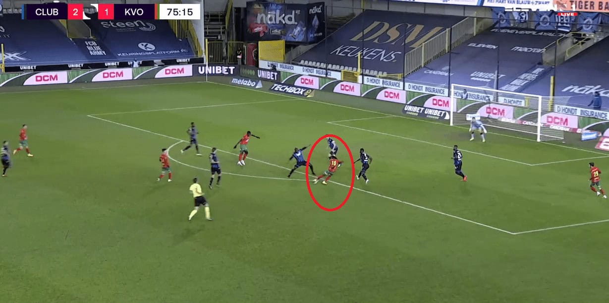 Moreover, he also deploys the side step technique to hold the ball against players and does well in executing that technique. This comes in handy when you are pitted against the strongest set of players. Rangers struggle against a physical opposition in the form of Slavia Prague where their players were unable to win the duels against the physically strong Slavia players. This is one of the reasons why Gerrard is interested in bringing the Zambian to Glasgow as he can be decent at winning these duels. An example of that technique is given below, where he protects the ball while then laying it off to his teammate as Oostende attack their opposition.