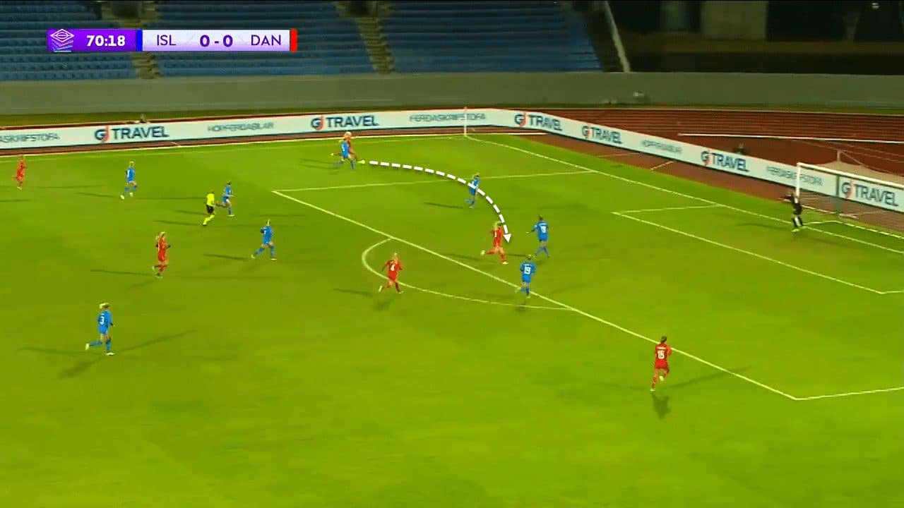 As soon as she got the ball, Svava fixed her direct marker, dribbled past her in a very fluid manner and then provided a backwards pass to her teammate without overthinking or losing time after dribbling.