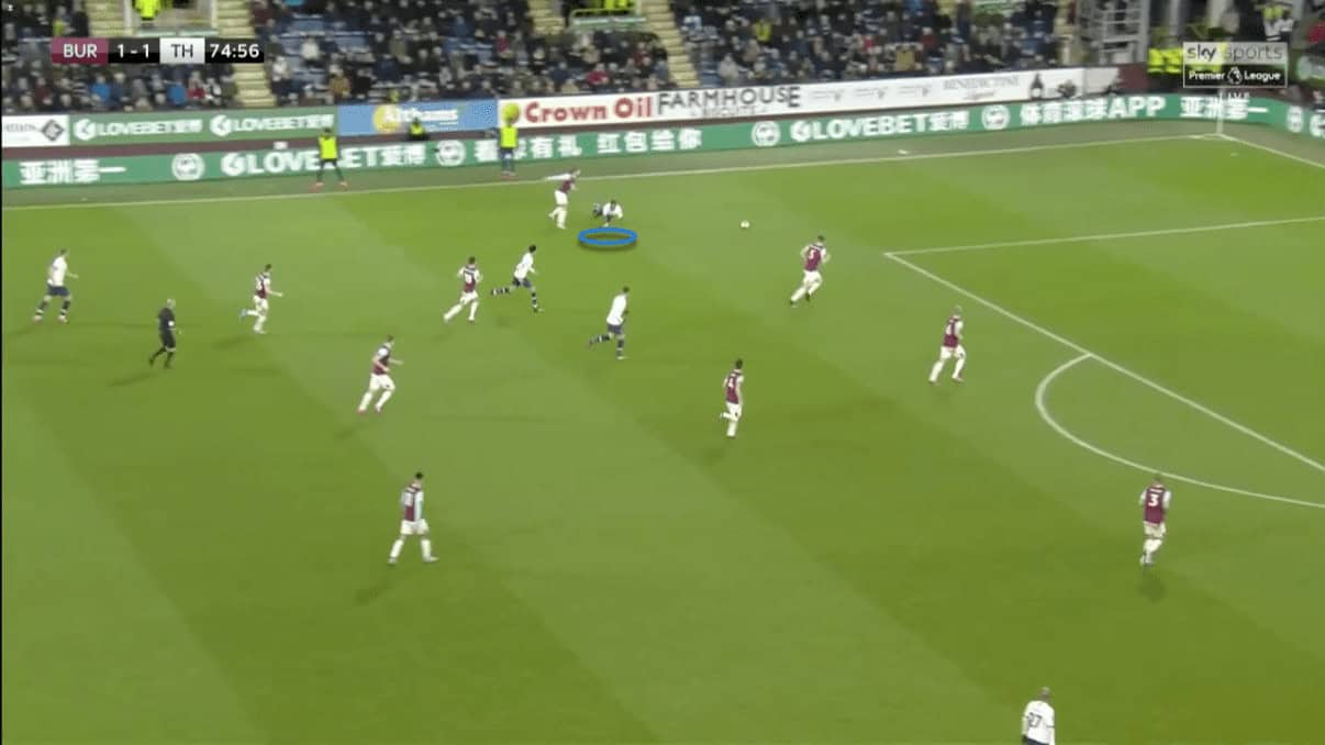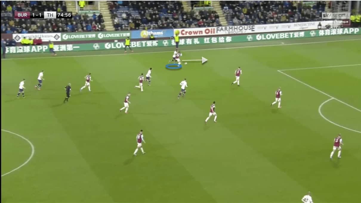 Bergwijn being an inverted left-winger also allows for more passing options from his stronger foot once he receives the ball. He has the ability to either pass the ball with the side of his boot to the midfielders on his right. He has the ability to pass the ball into the box for the striker to receive or cross it to the other winger, with both passes using the foot that is away from the right-back defending him. Finally, he can switch play completely, and pass it to his right-back, again with his stronger foot. This play specifically is a fantastic way to catch the opposition off guard, as they will likely be unprepared to receive an attack from the right side of the pitch. The pass is usually too fast for the defence to reset, and it gives the attacking team (Tottenham in this example), the chance to attack quickly and freely.