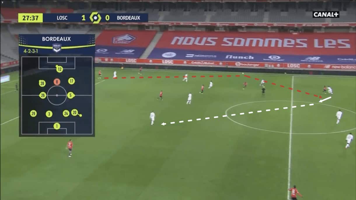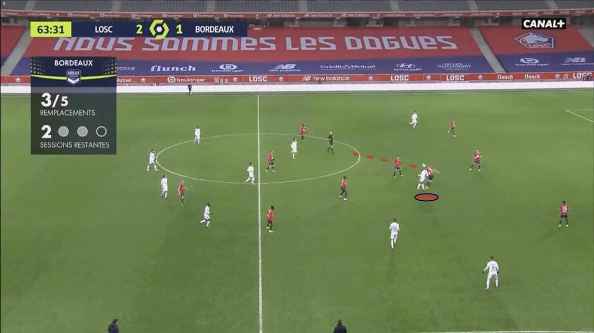The Dutchman likes to push out into wider areas to engage in defensive duels with opposition players 1v1. This is particularly useful should Lille’s left-back, usually Domagoj Bradarić, get beaten or caught out of position during a moment of transition.