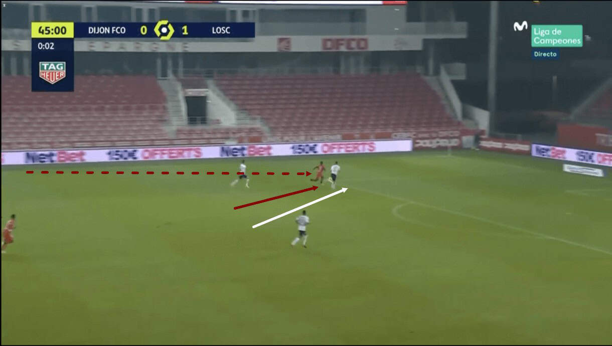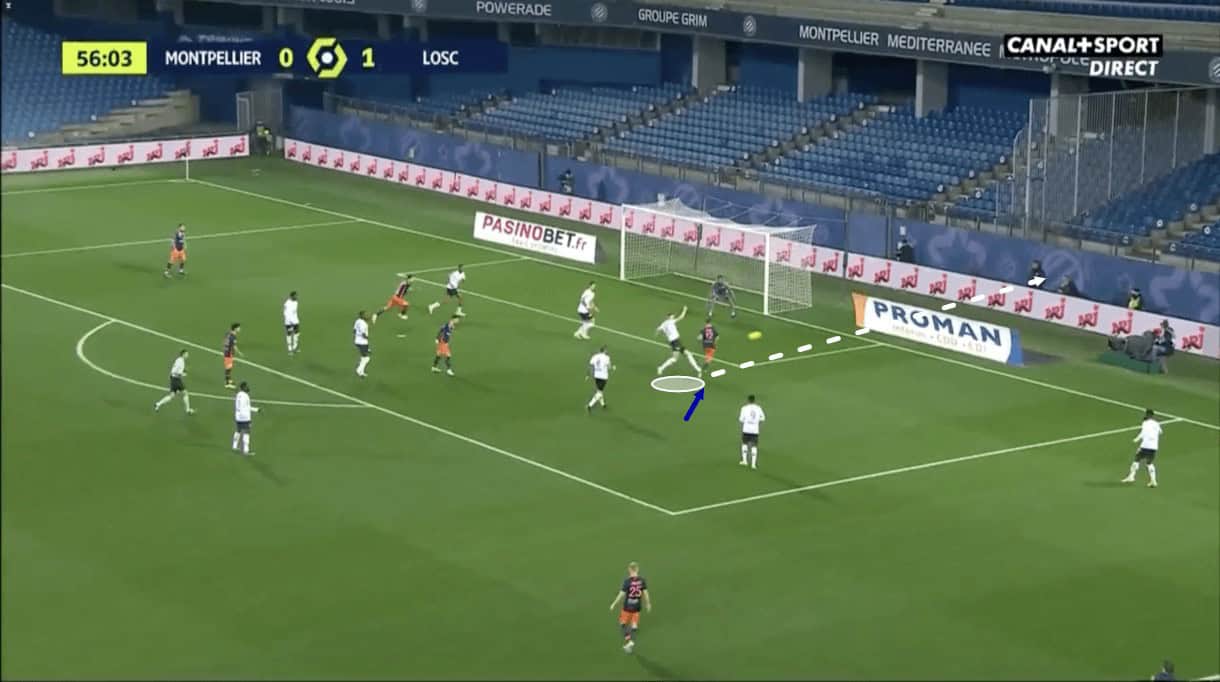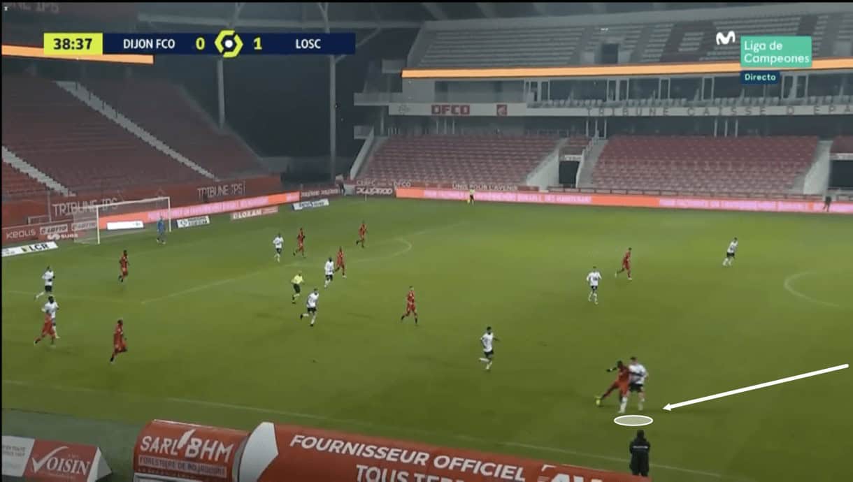 As he did so, he played the ball into a very similar area we saw him play the ball in the previous image, but on this occasion, the intended target of the Lille attacker was unable to get onto the end of the pass, as he was beaten to the ball by the opposition defender.
