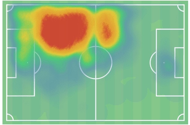 The heatmap above shows us Botman’s average positioning for Lille in the 2020/21 campaign. We can see that, as you’d expect, he spends the vast majority of his time in the area just to the left of the centre of the pitch in his own half, but one particularly notable element of this heatmap is how wide the red area of this heatmap stretches.