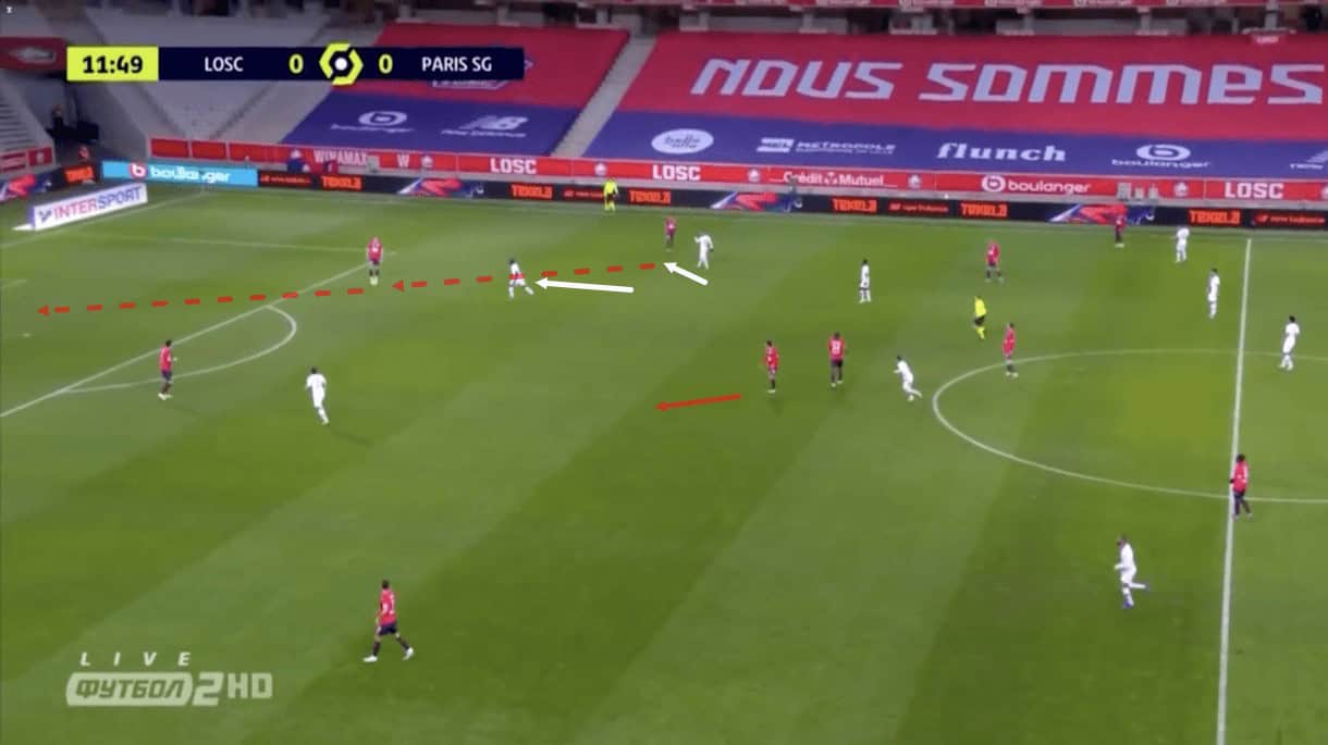 Though this wasn’t always achieved by PSG, they did cause Botman a lot of problems and, as a result, stifled Lille’s build-up play, via this pressure.