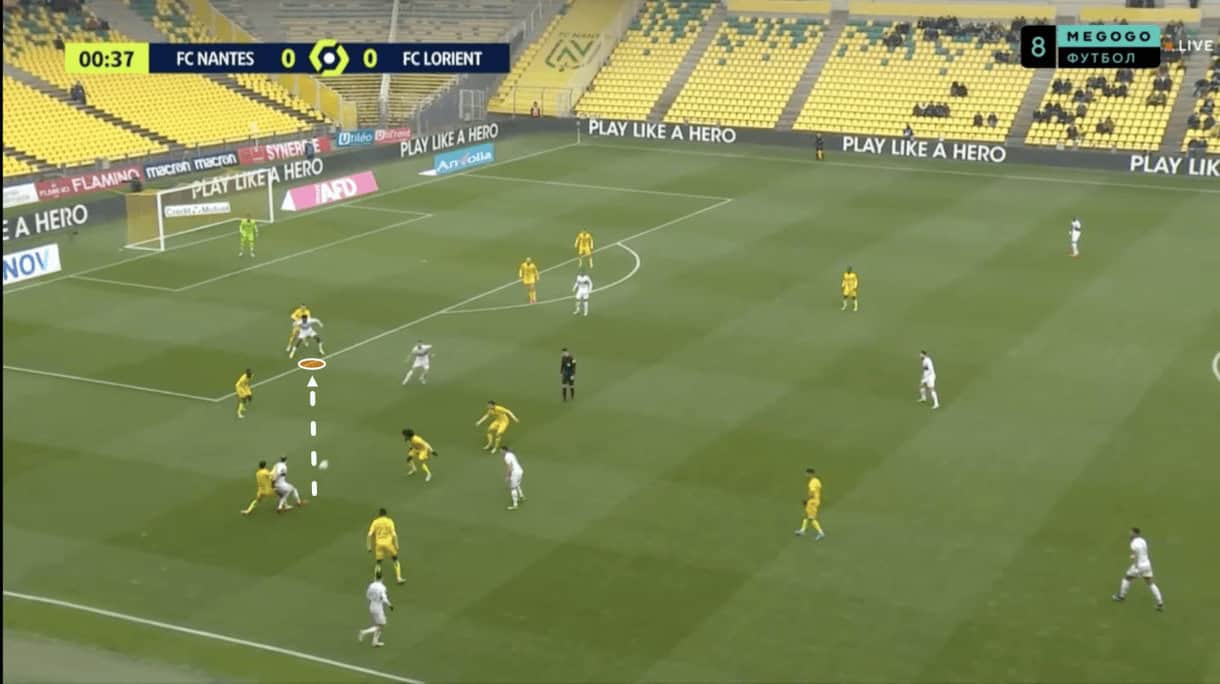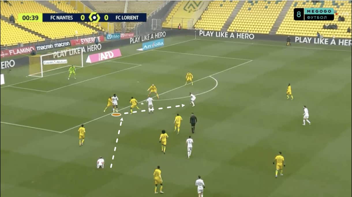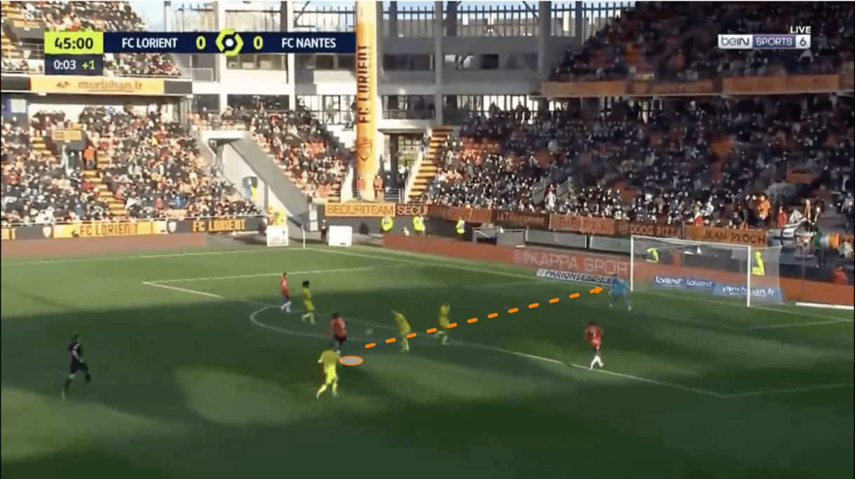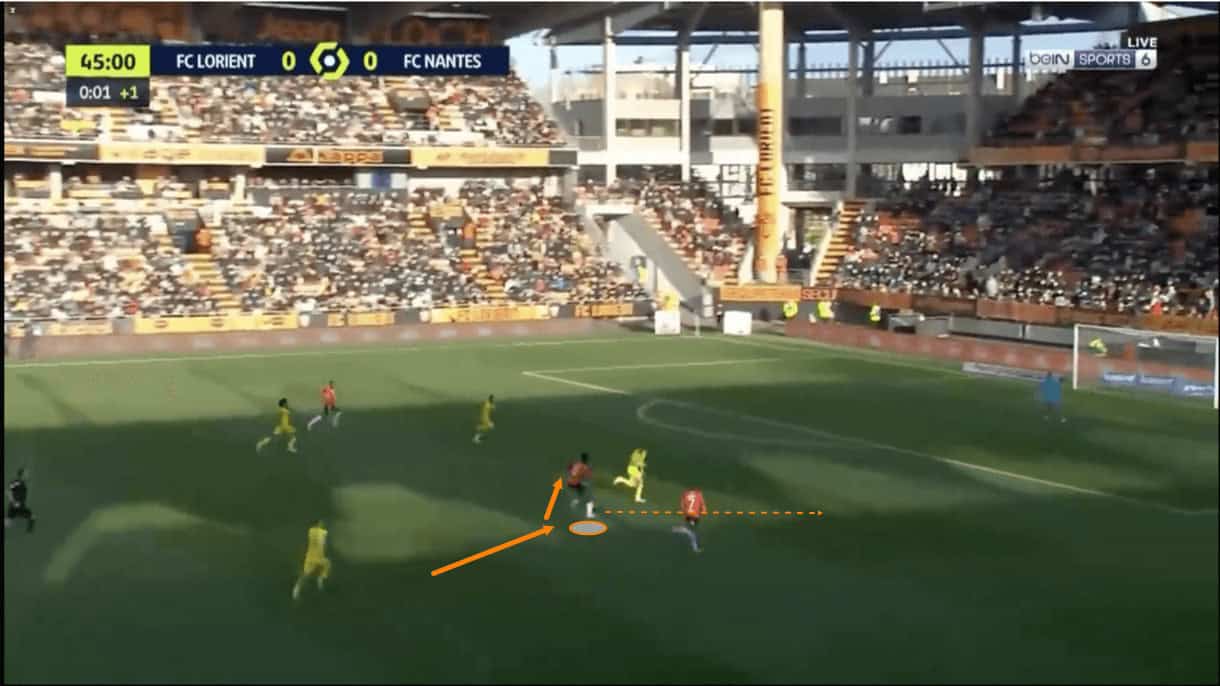 In figures 12-13, we see an example of what I’d determine to be some fairly poor decision-making from the Lorient attacker when approaching the final third. Firstly, in figure 12 we see Moffi carrying the ball into the final third, with Lorient going into a potential 3v2 versus the opposition backline at this moment. While the attacker had one option on his outside running into space, he opted to cut inside onto his stronger left foot and go it alone instead of taking that overlapping option. This wouldn’t be a problem if he had the pace, agility and technical quality to really drive at this defender and go past him but that wasn’t the case for Moffi here.