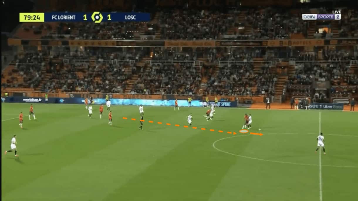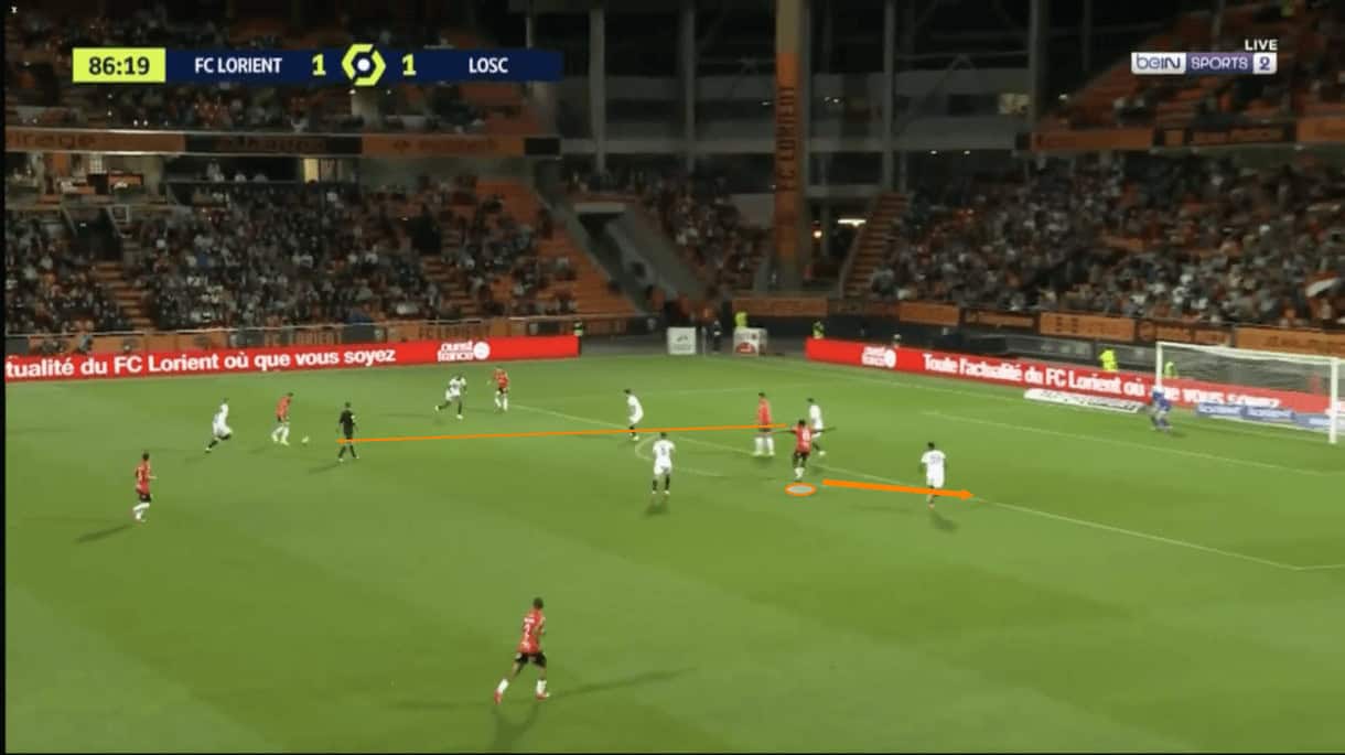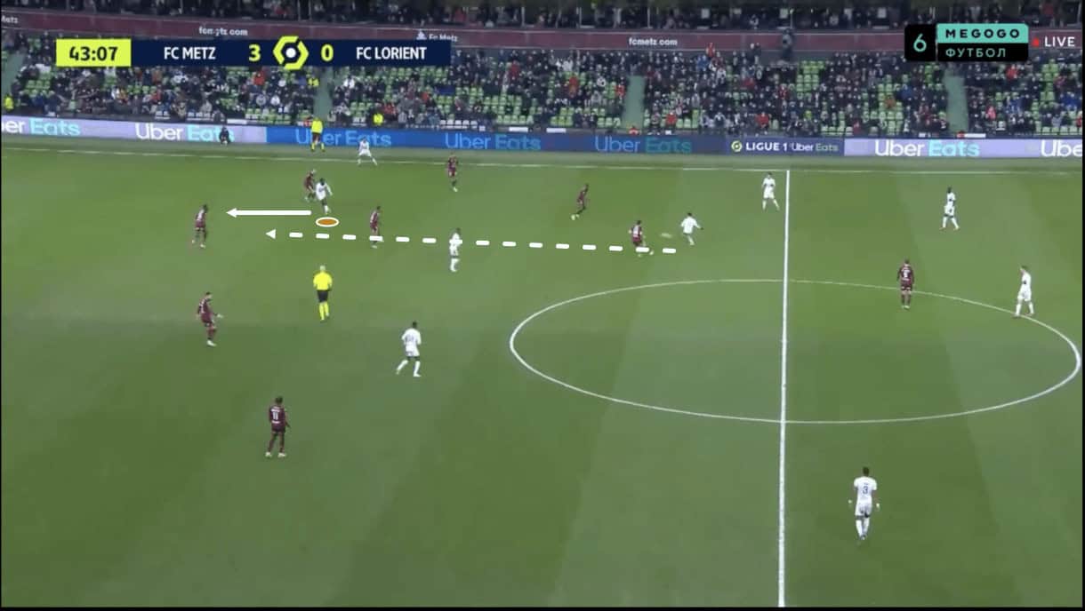 As play moves on into figure 6 here, we see that as Moffi receives, he successfully directs the ball into the attacker occupying the always dangerous zone 14 just on the edge of the area, with that Lorient man enjoying plenty of time and space to create something from there. The Nigerian attacker played a key role in this move thanks to his physicality and well-executed pass.