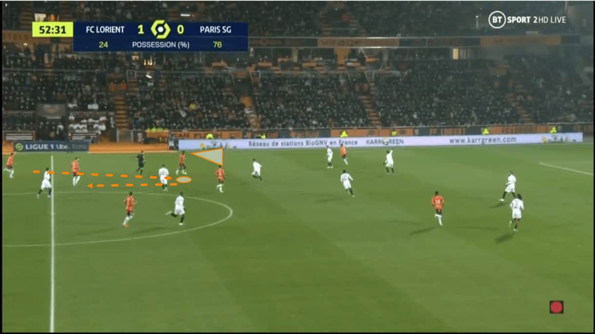 Similarly, Moffi can end up in a deep position, as he did in figure 11 versus PSG, tasked with either carrying the ball forward or playing a line-breaking forward pass. As mentioned earlier in this analysis, while the Nigerian is good at providing a link-up option for teammates inside the final third and this is a strength of his game, he’s not a creative passer who’s going to split the defence apart with a through ball. In a situation like we see in figure 11, you’d much, much rather have Moffi as a runner than have him as the ball carrier. He and his team should aim to minimise the number of times the attacker finds himself in this kind of position and situation, as it’s not a dynamic that best suits Lorient at all.