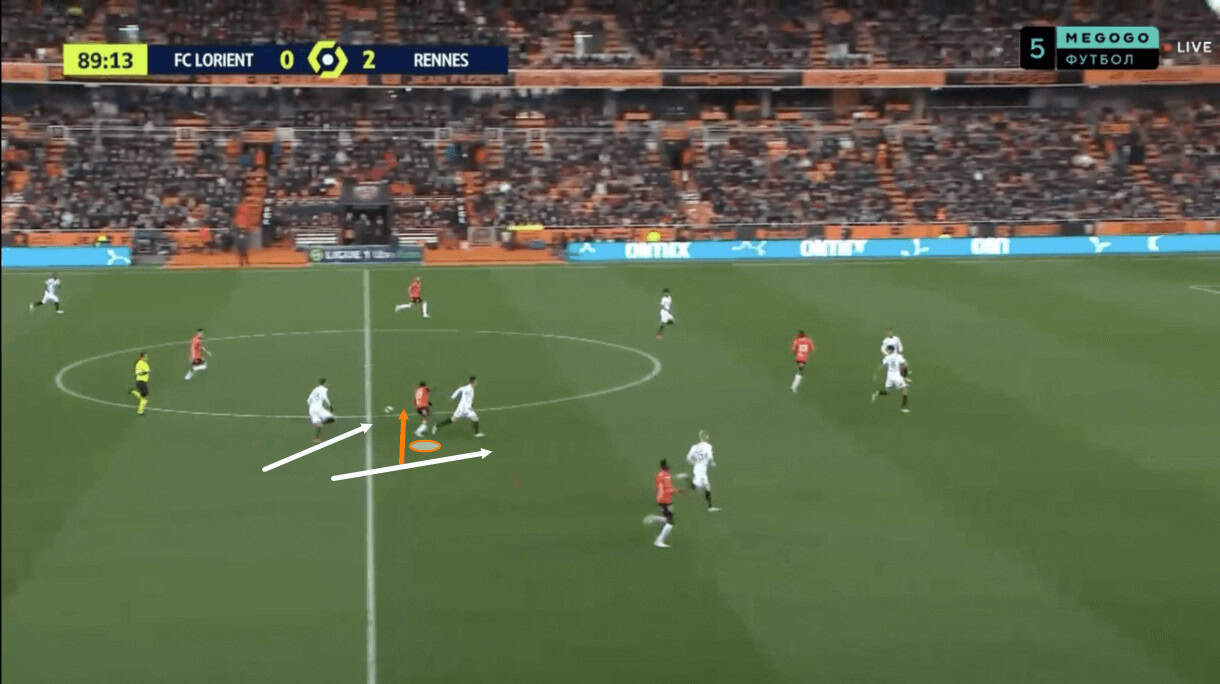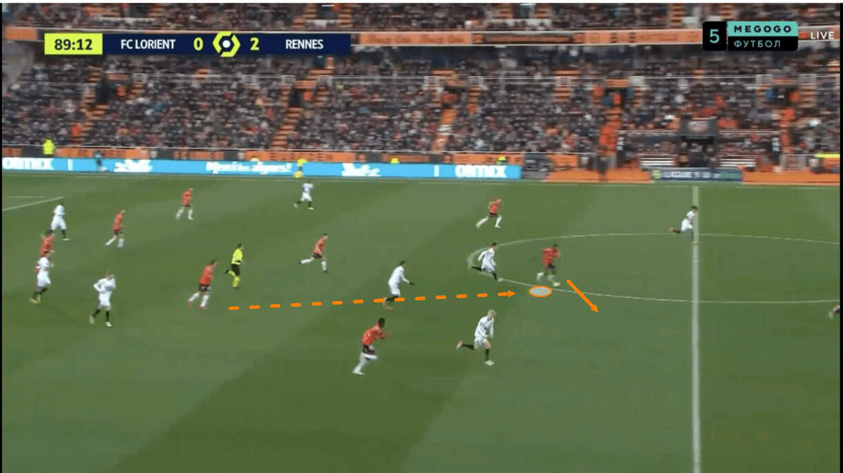 As this particular passage of play moves on into figure 10, we see that one of the Rennes midfielders who was chasing Moffi has actually caught up with the Lorient attacker and got back in front of him as a result of his acceleration troubles and issues with getting the ball out from under his feet on receiving the pass in figure 9, leading to the attacker now being forced to try and beat the Rennes player in a 1v1 duel.