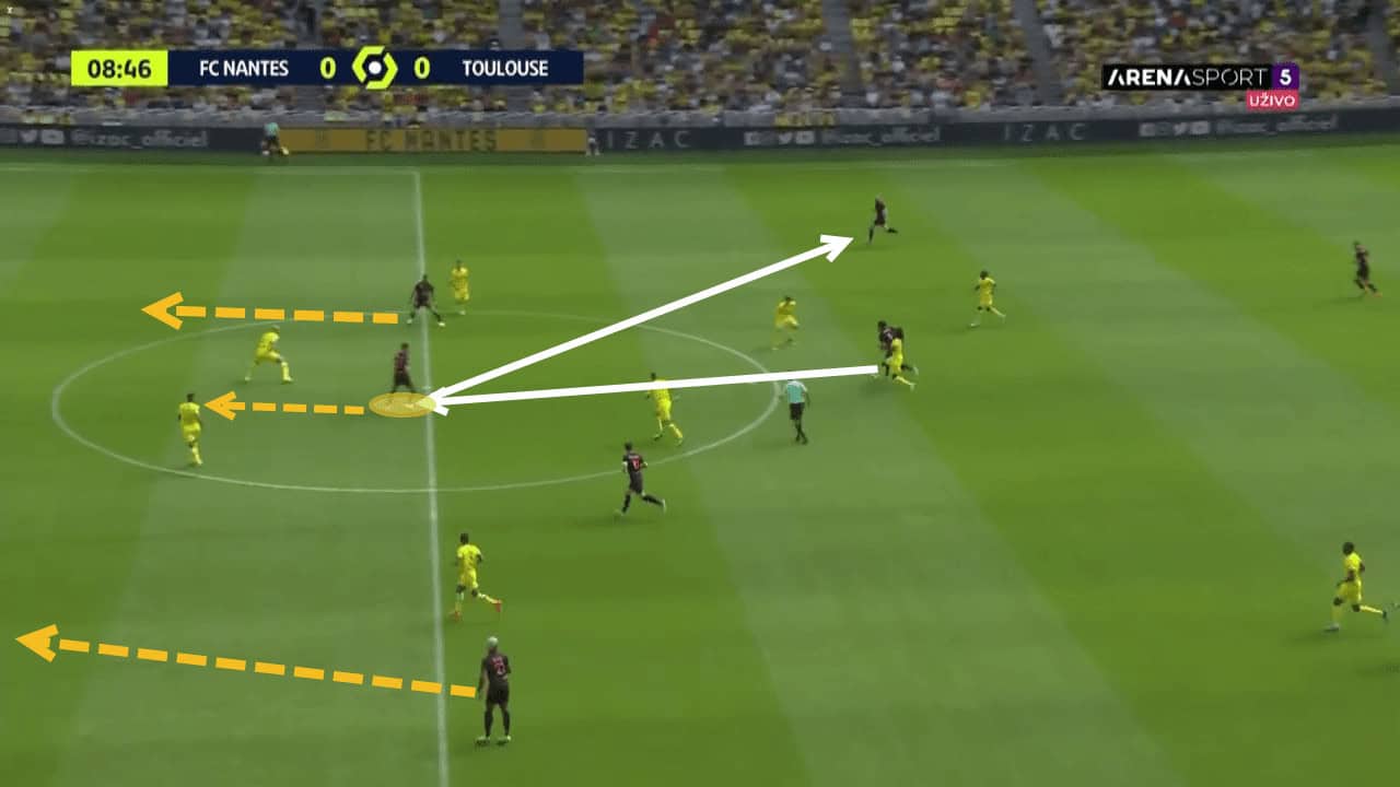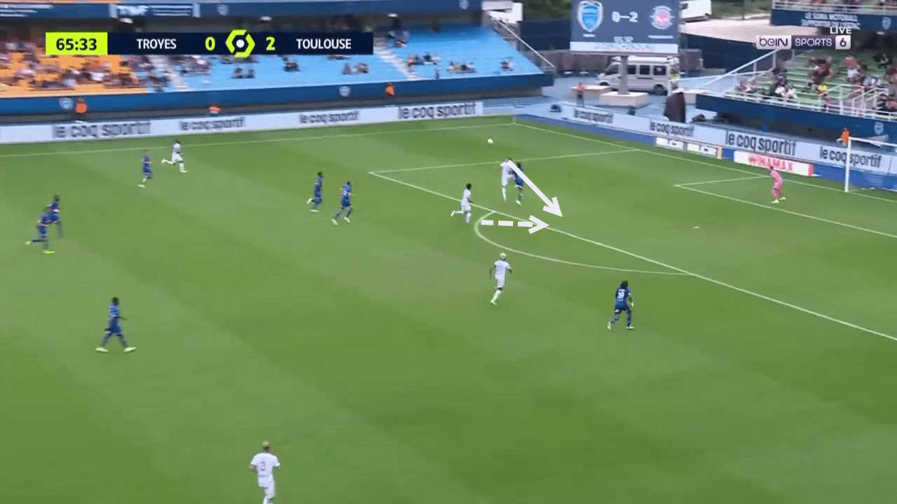 Above is an example of how Toulouse have utilised Dallinga in their build-up play. By playing long into his chest, Toulouse can quickly bypass the opposition’s midfield. Dallinga has good awareness and is able to chest the ball down first-time to bring a teammate into play.