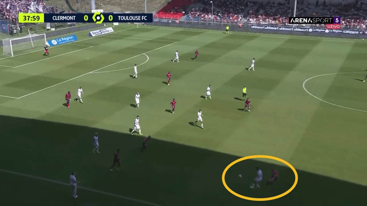 As mentioned, Dallinga is being frequently used aerially by Toulouse. It is important that Toulouse get players around him in these situations. His ability in the air is okay for a player of his stature. His teammates must support him in these situations as the ball drops into dangerous areas.
