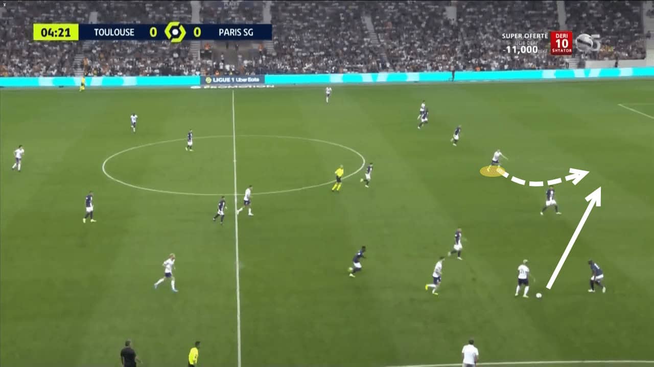 Out of possession, Dallinga’s role is clear. To shape the opposition’s attack. Dallinga is Toulouse’s first line of defence and his running and positioning dictate play. He forces the play down one side of the pitch which then enables his teammates to press easier as the playing area is now smaller.