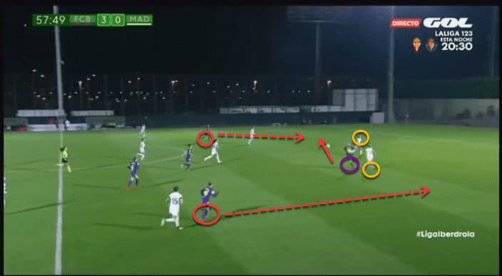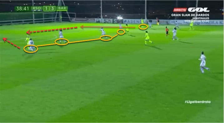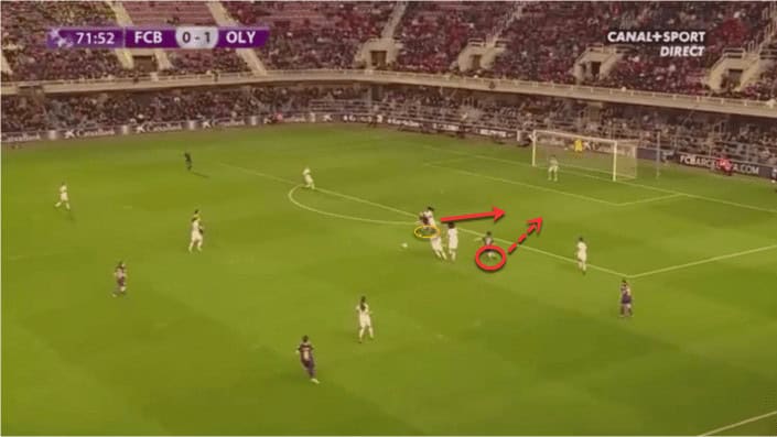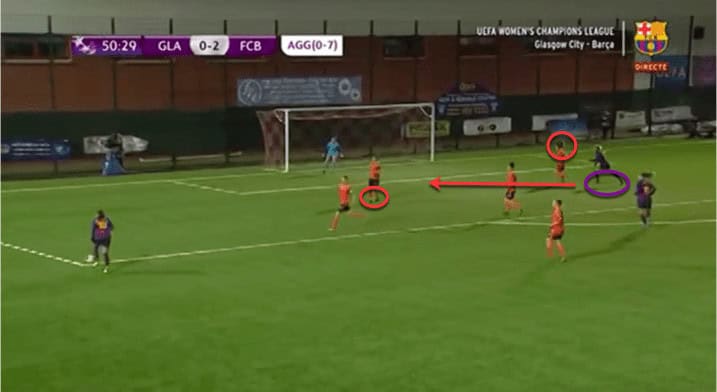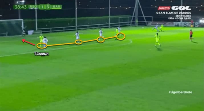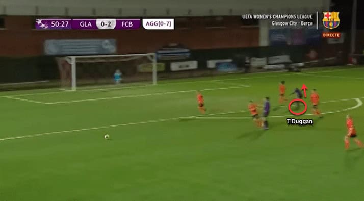 As the above example highlights, Barcelona look to seize upon a ball they won high up the pitch through the interception. Duggan recognises this and looks to drive into the space in front of her pulling her marker with her. The image indicates the two players she could potentially play in on either side. She uses her movement to create space for her two wingers by pulling one into another, whilst the third defender is busy ball watching.