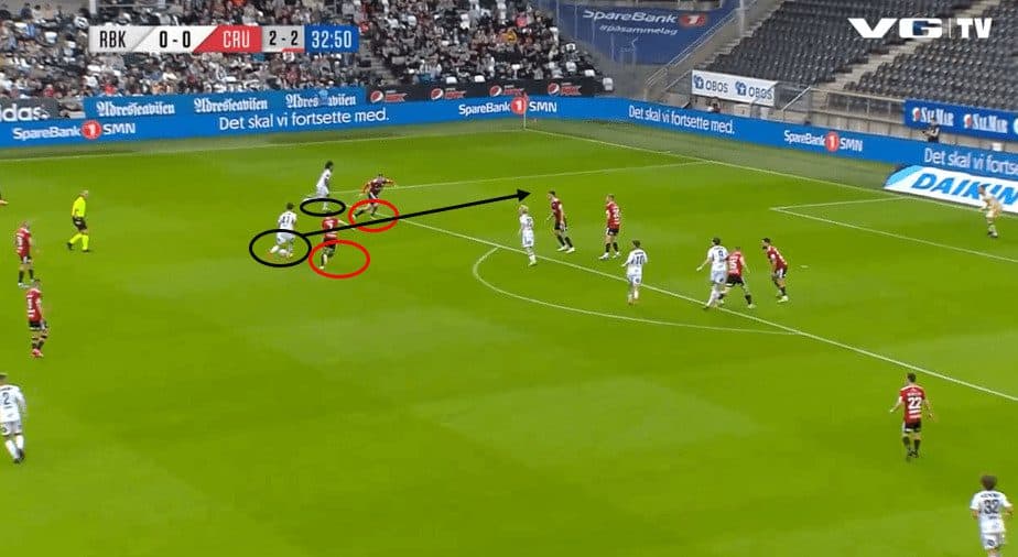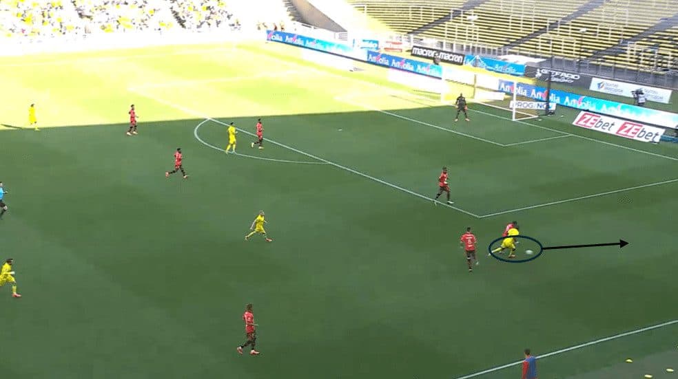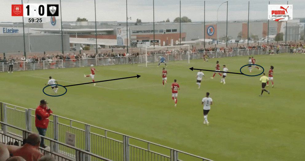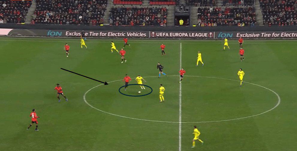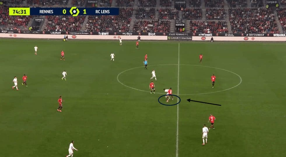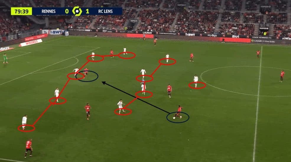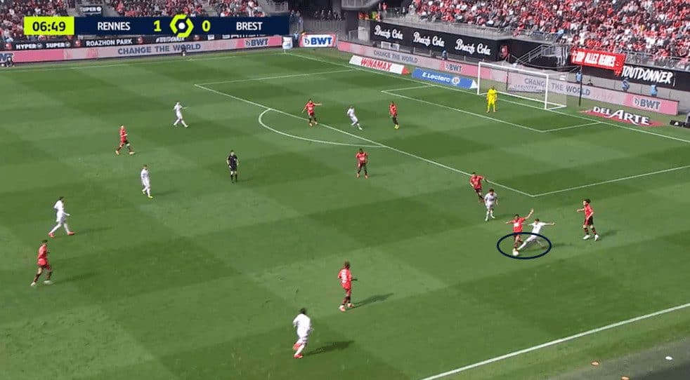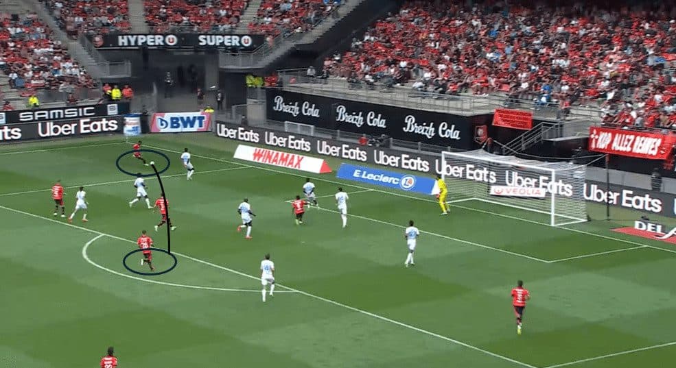 This movement also drags the opponent’s right centre-back up to press the striker, creating space for the Rennes winger.