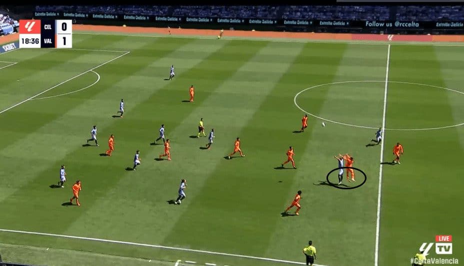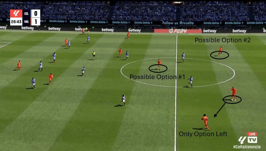 In the image below, we can see that when Gasiorowski receives the ball, his body is closed off to his right, limiting him to only playing to his left back.