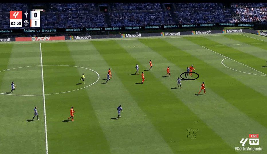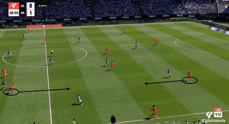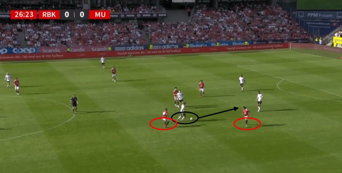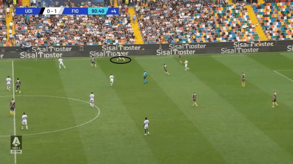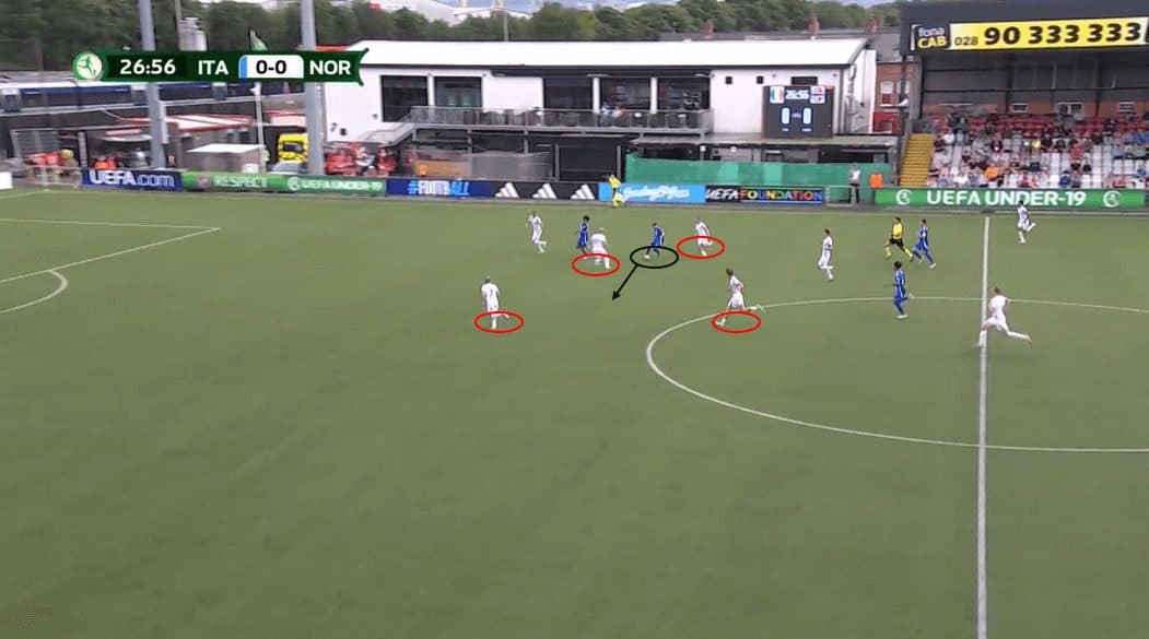 In the first image, Pafundi showcases “La Pausa.” He takes a few extra yards while dribbling forward, allowing his winger to run in behind.