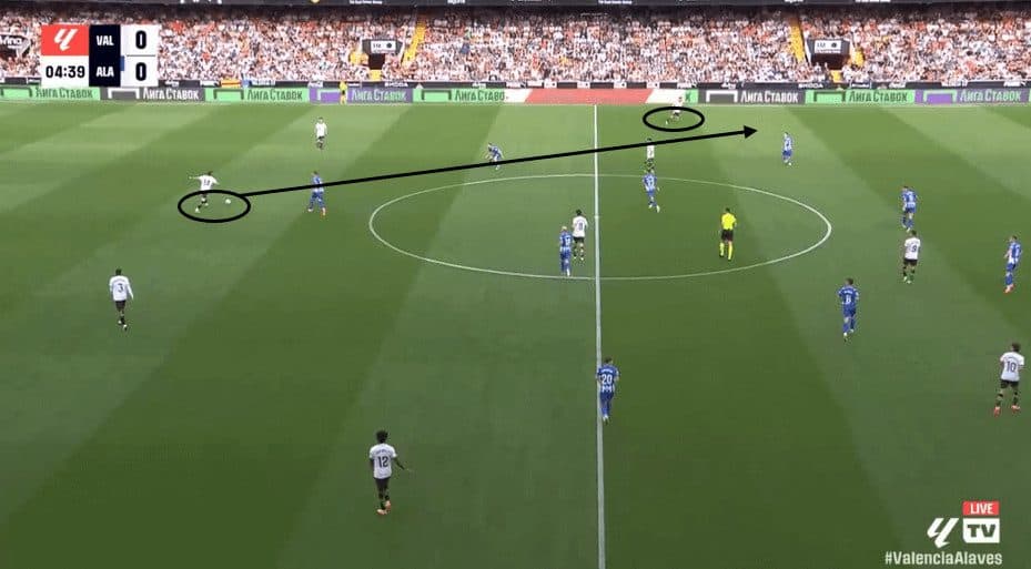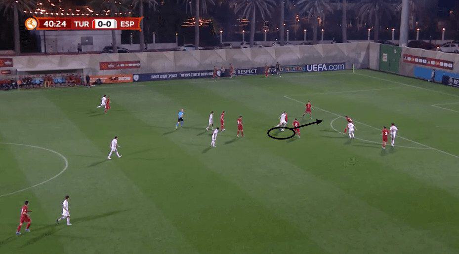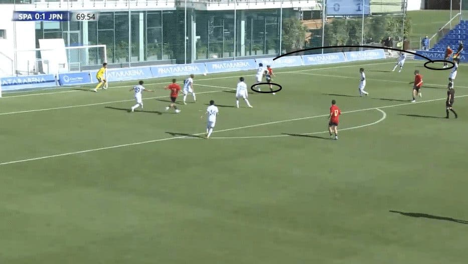 When the opponent’s centre-back steps up, Pafundi releases the ball perfectly, allowing his winger to receive it behind the defence.