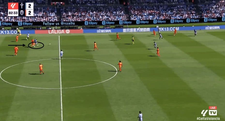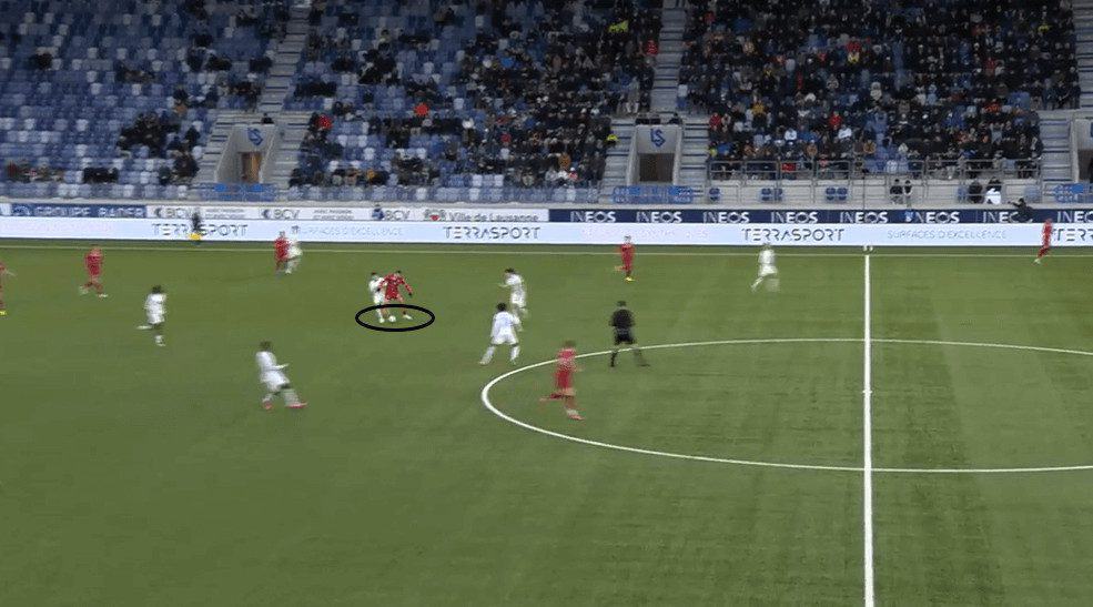 In the second image, we observe his use of the low centre of gravity and change of direction in a build-up phase of play rather than the attacking zone of the pitch.