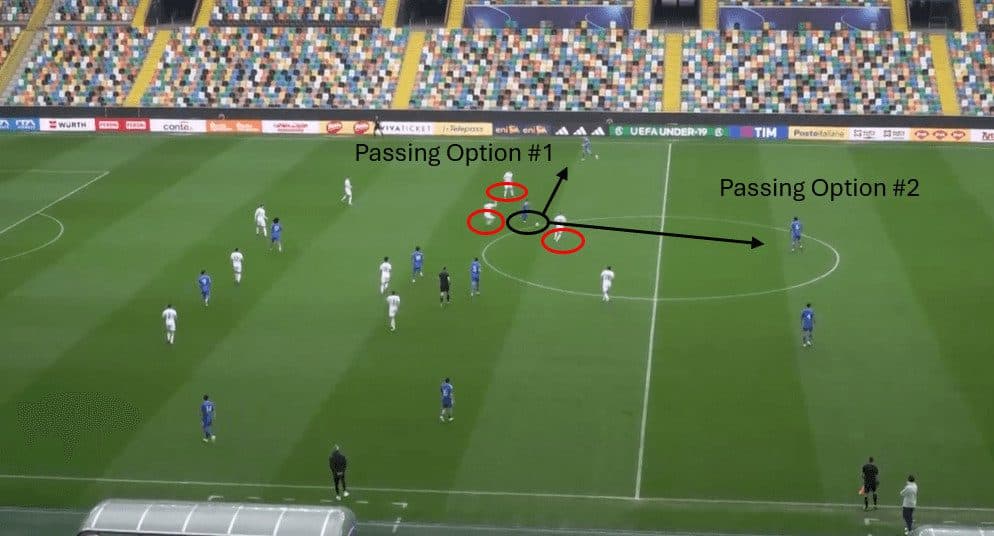 Notice the player directly in front of him, marked in red, facing a different direction than where Pafundi is dribbling.