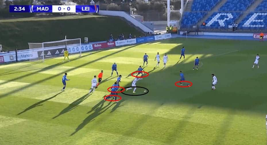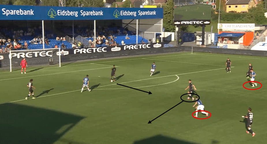 Instead, he sees his striker coming to receive a short pass and successfully plays a pass between three players to his striker, who then plays it right back to Belocian.