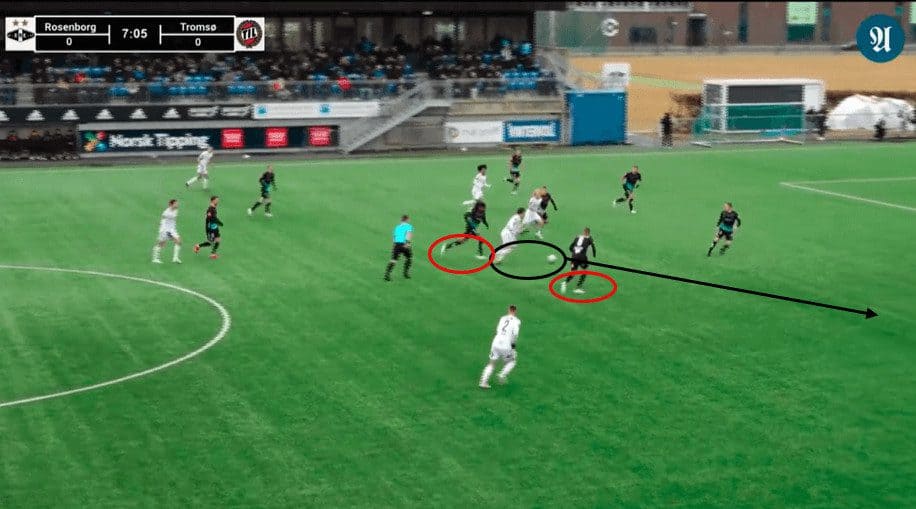 The images below show two examples of his passing, breaking the opponent’s defensive structure.