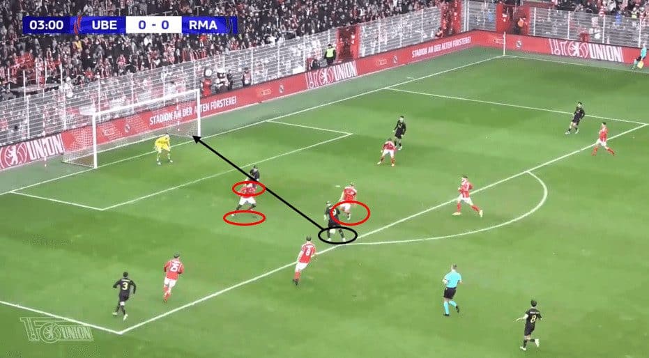Under pressure, he delivers a great cross to his striker, marked in black, who is making a run into the box.