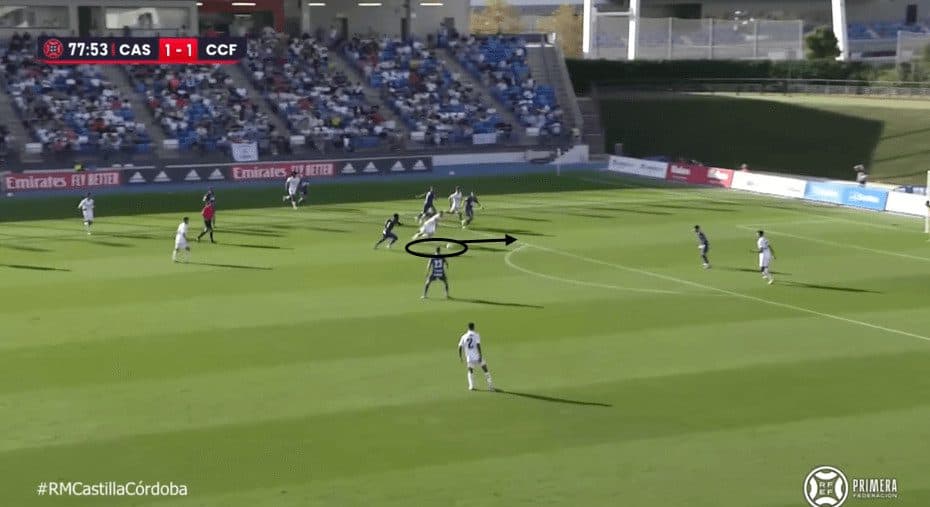 This composure is due to his constant scanning of the field, which allows him to know the positions of both opponents and teammates, enabling him to execute quick flicks or simple passes effectively.