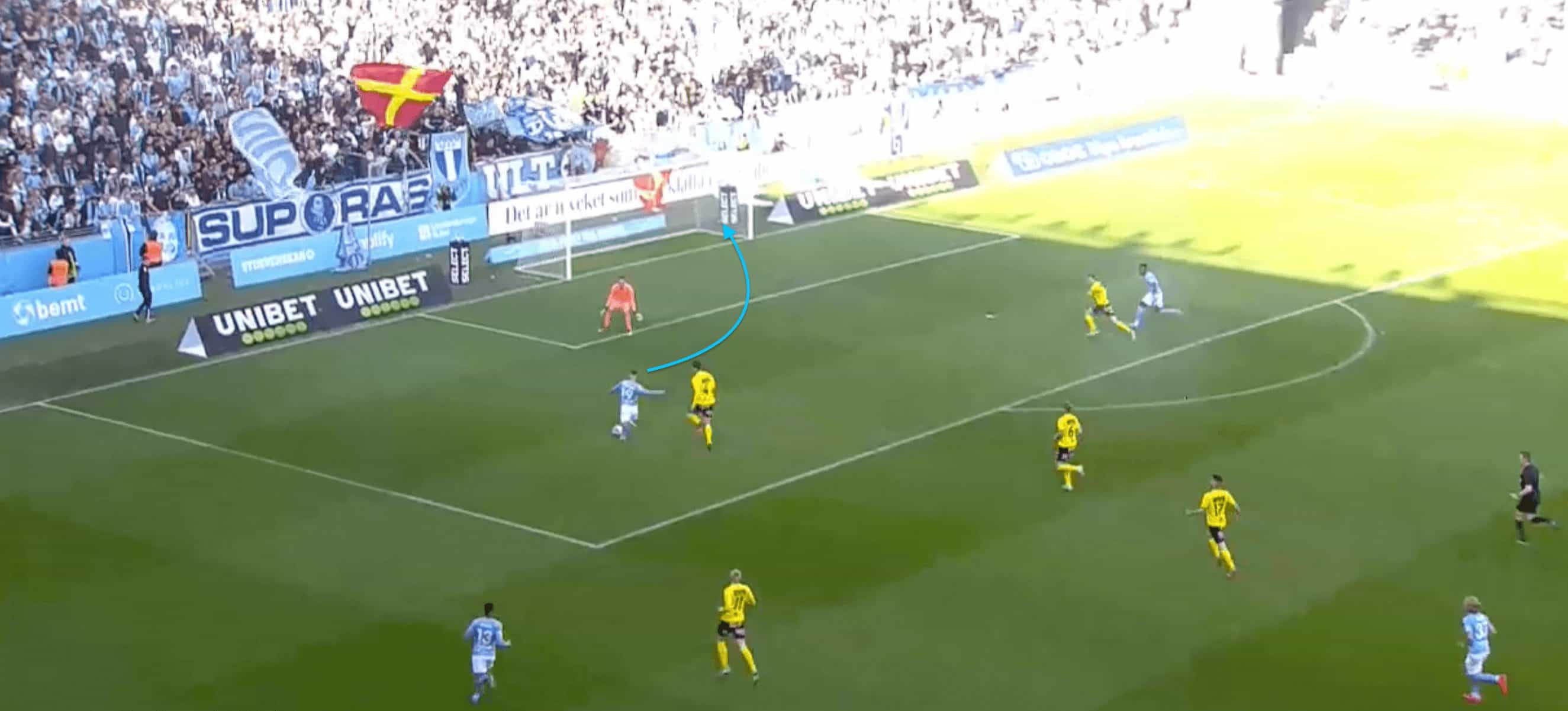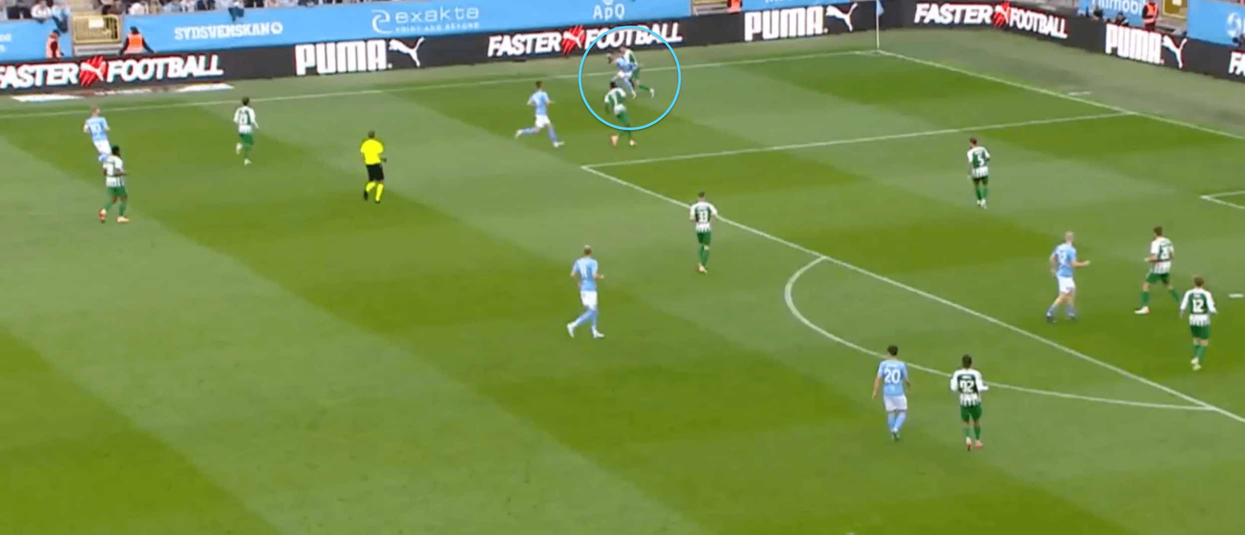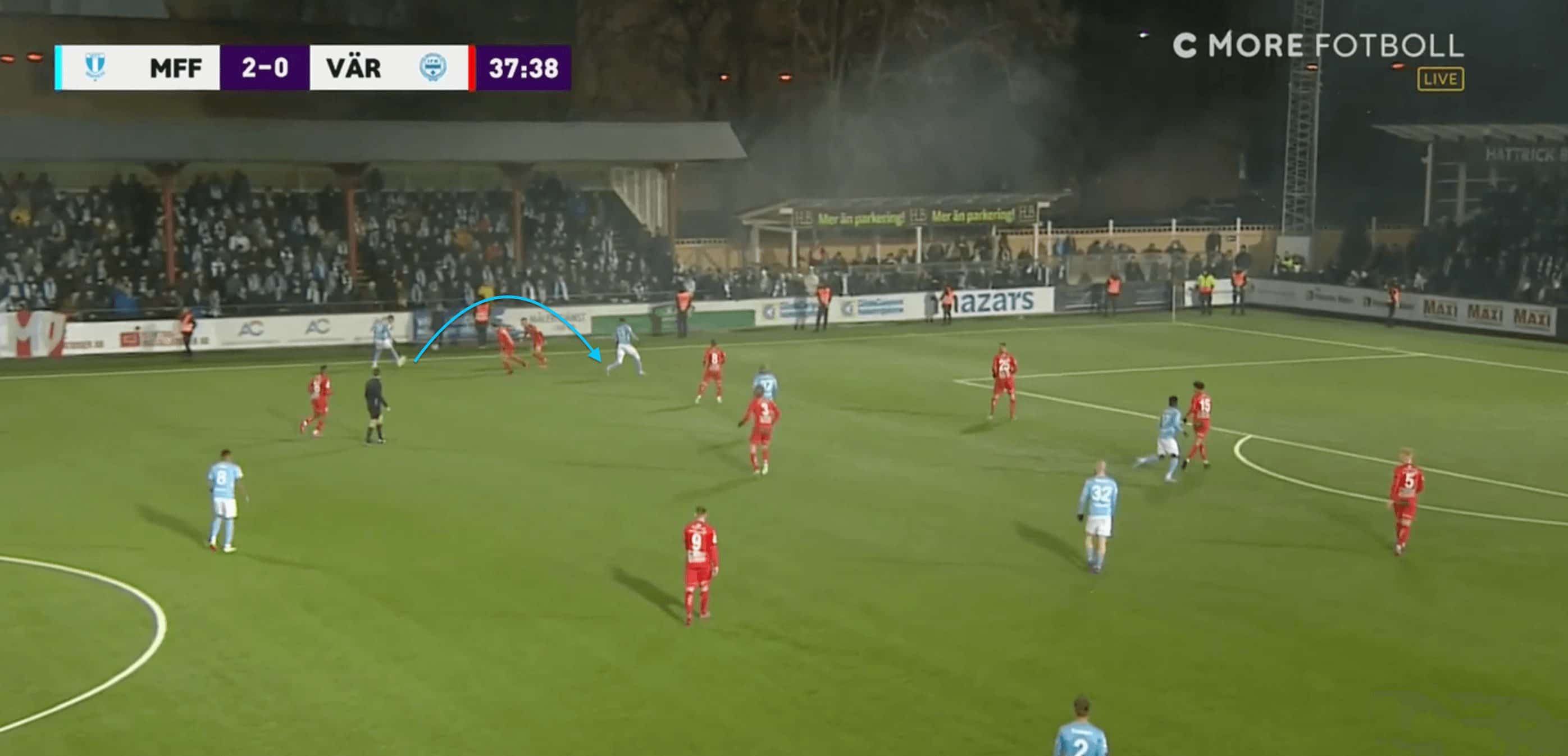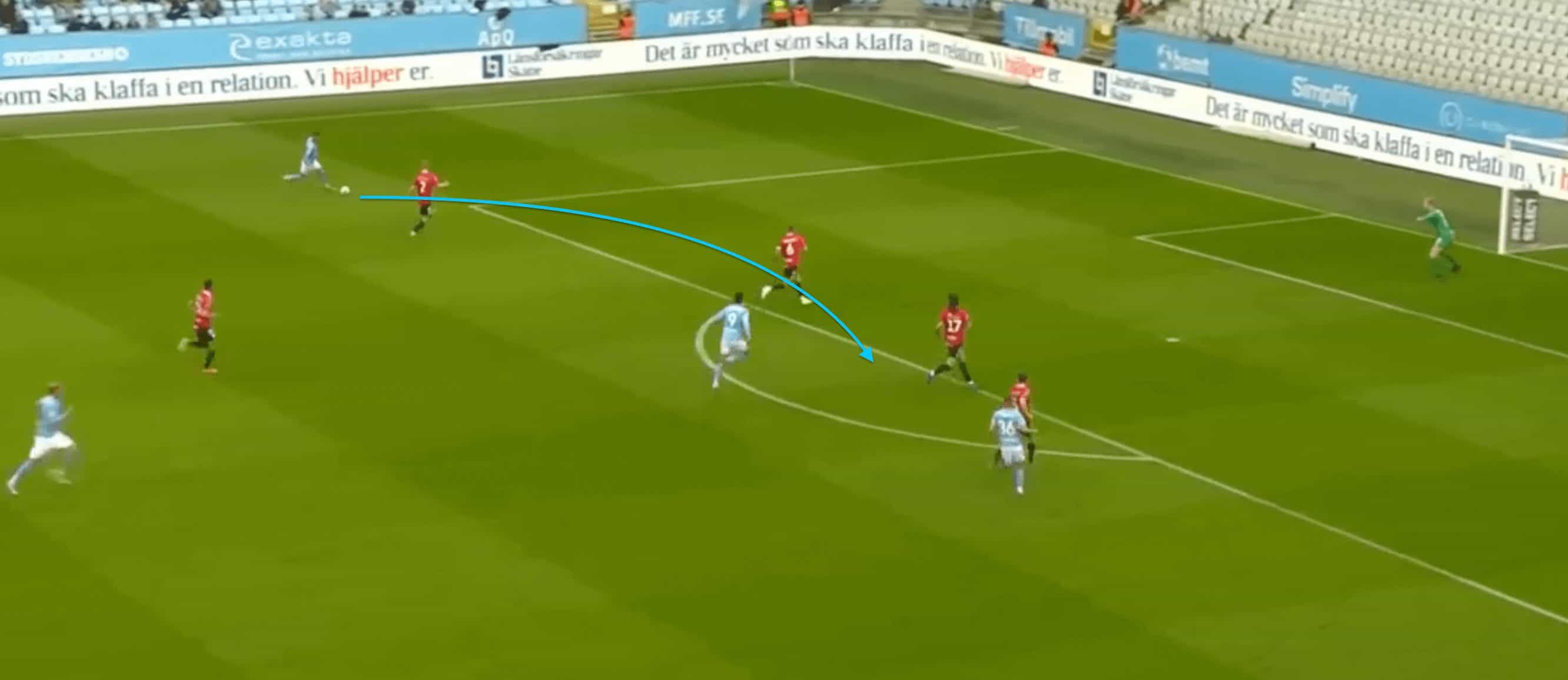 This is another example of him making a run, but this time, the whole opposition defence is very messy, which makes it easy for Malmo to create a good chance out of it and get into the opposition’s final third.