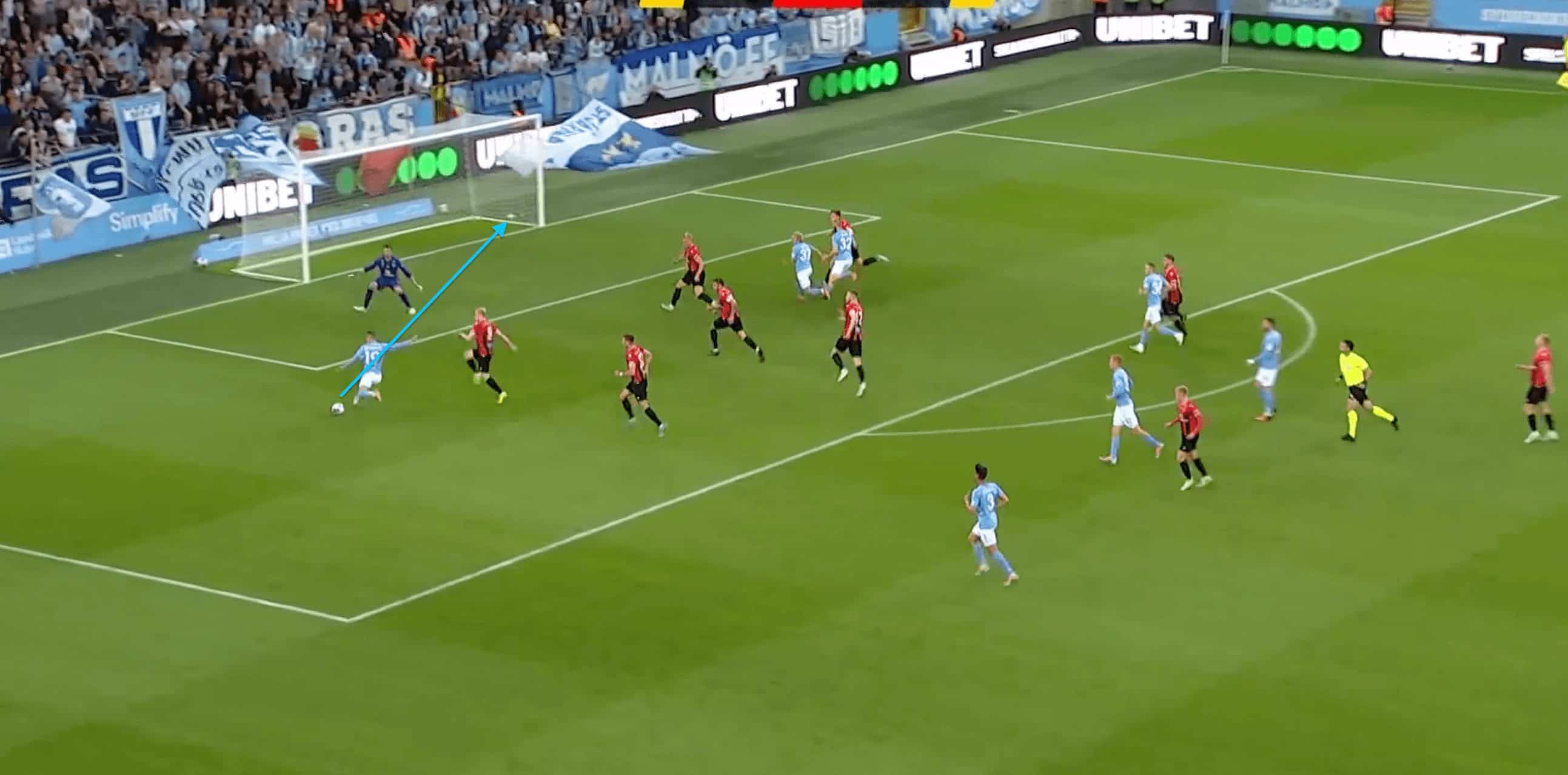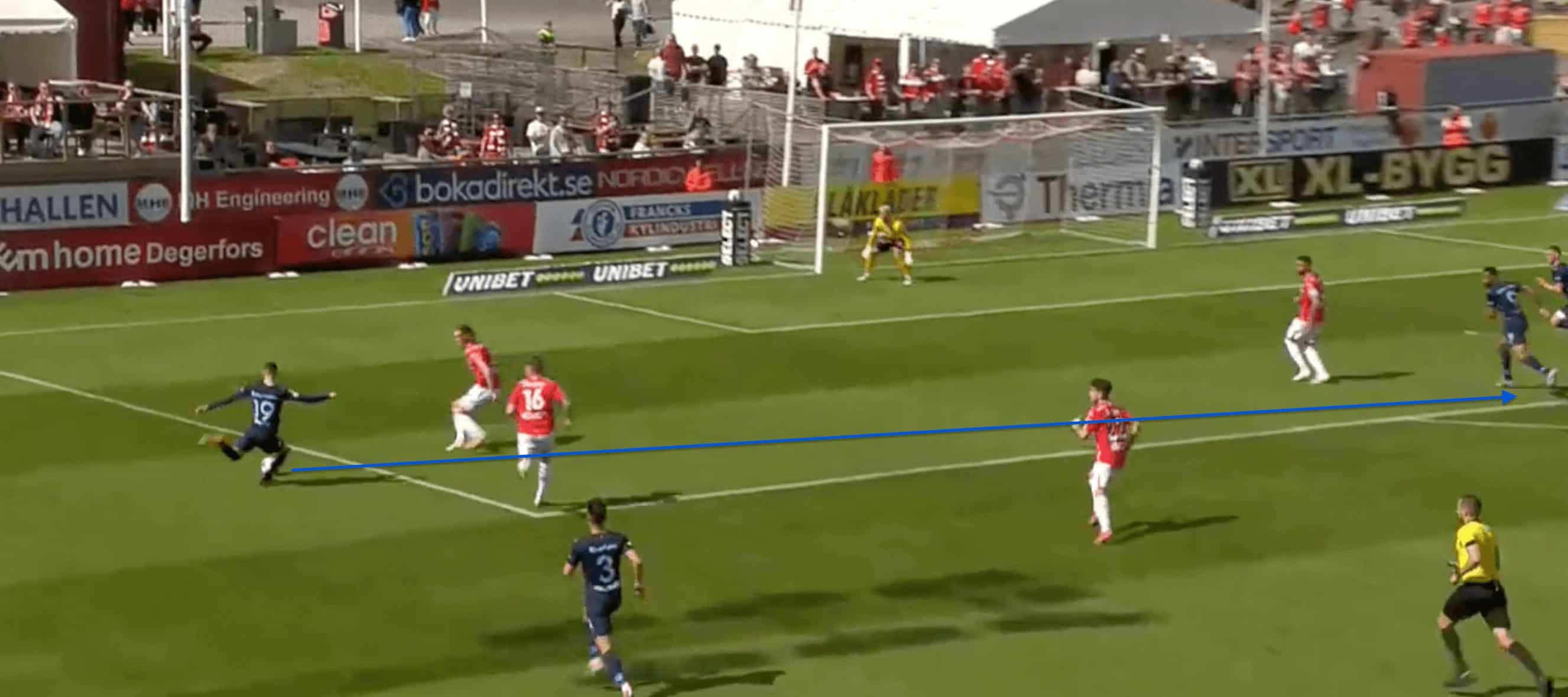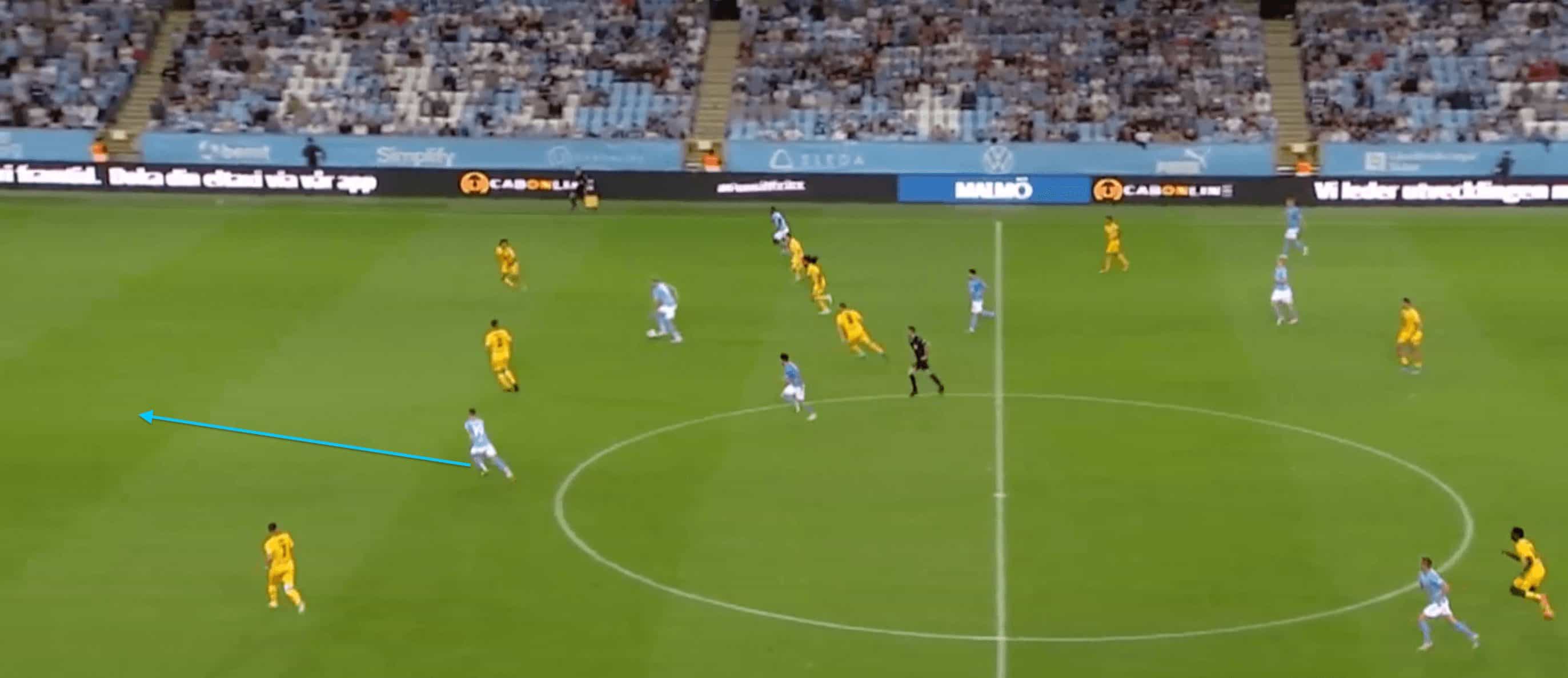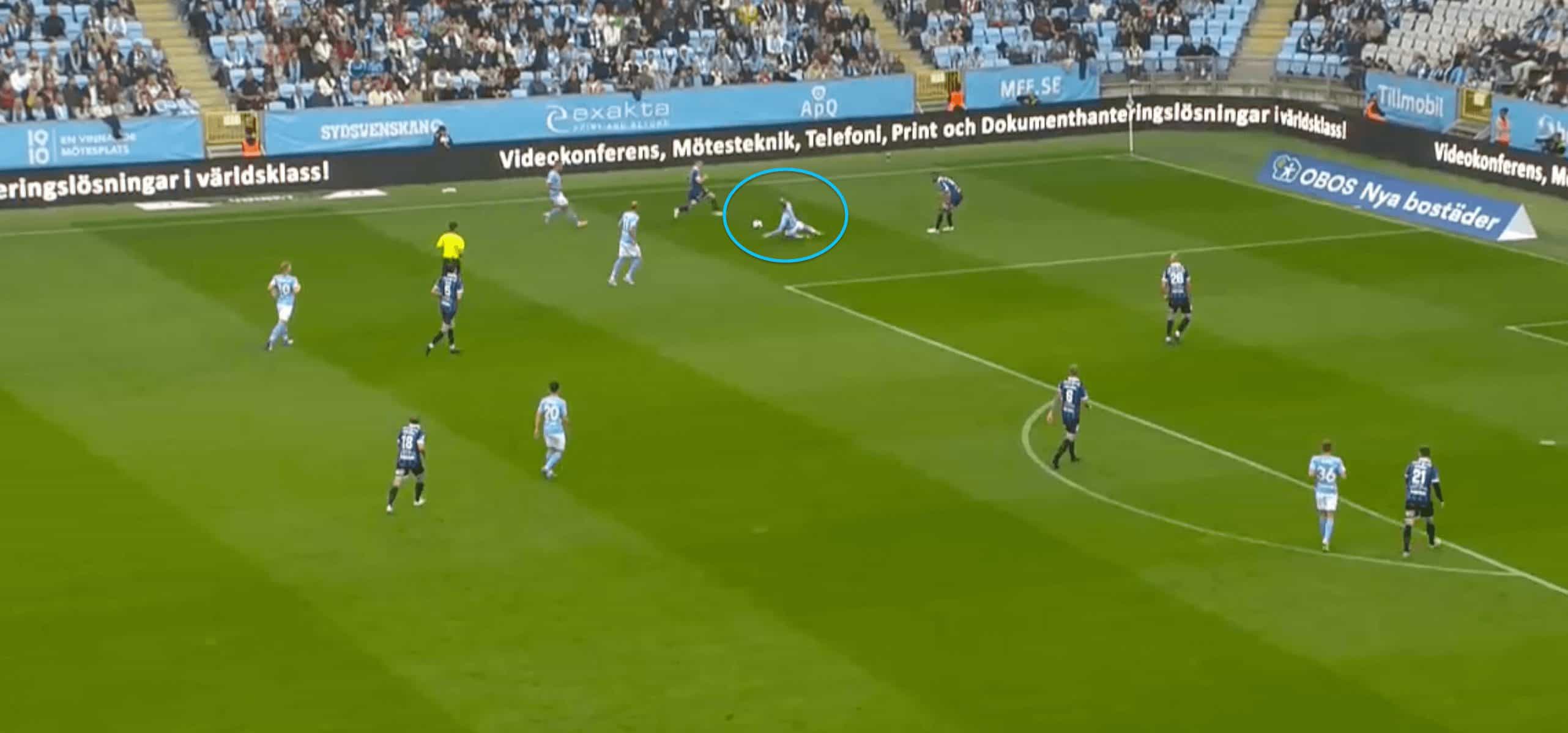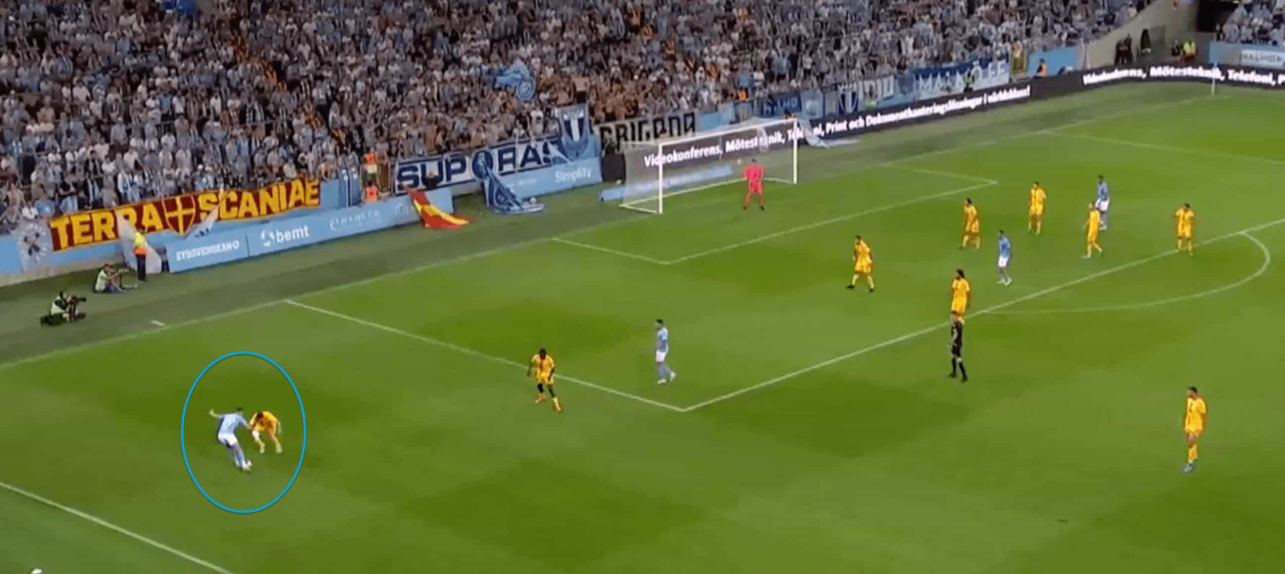 This is another example of him making a run, but this time, the whole opposition defence is very messy, which makes it easy for Malmo to create a good chance out of it and get into the opposition’s final third.