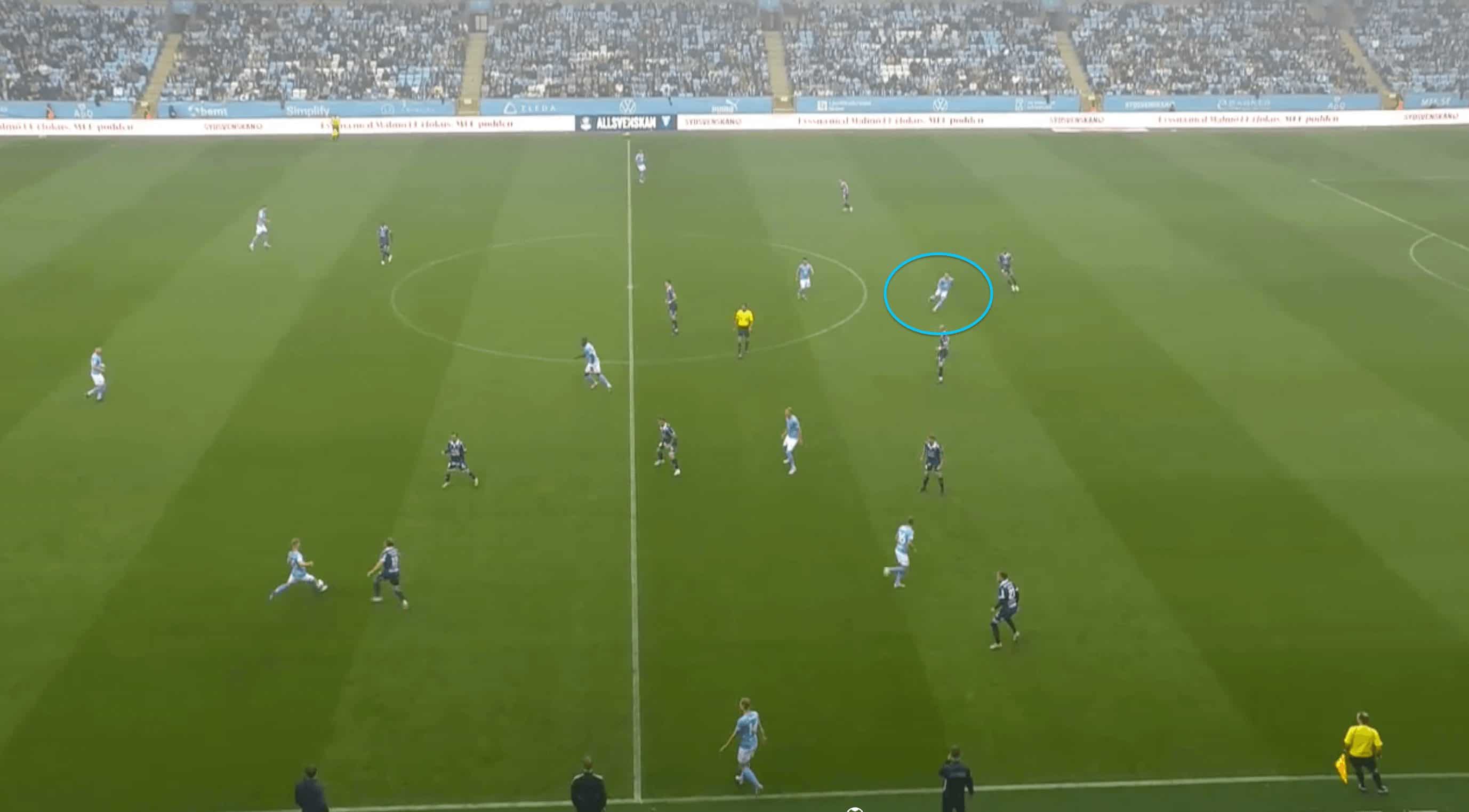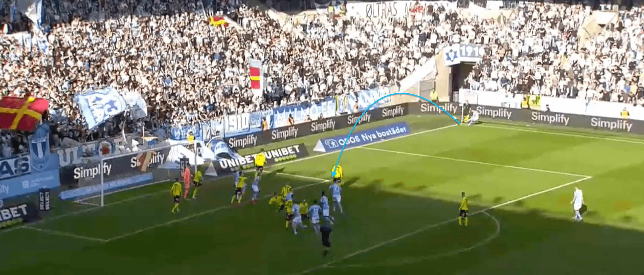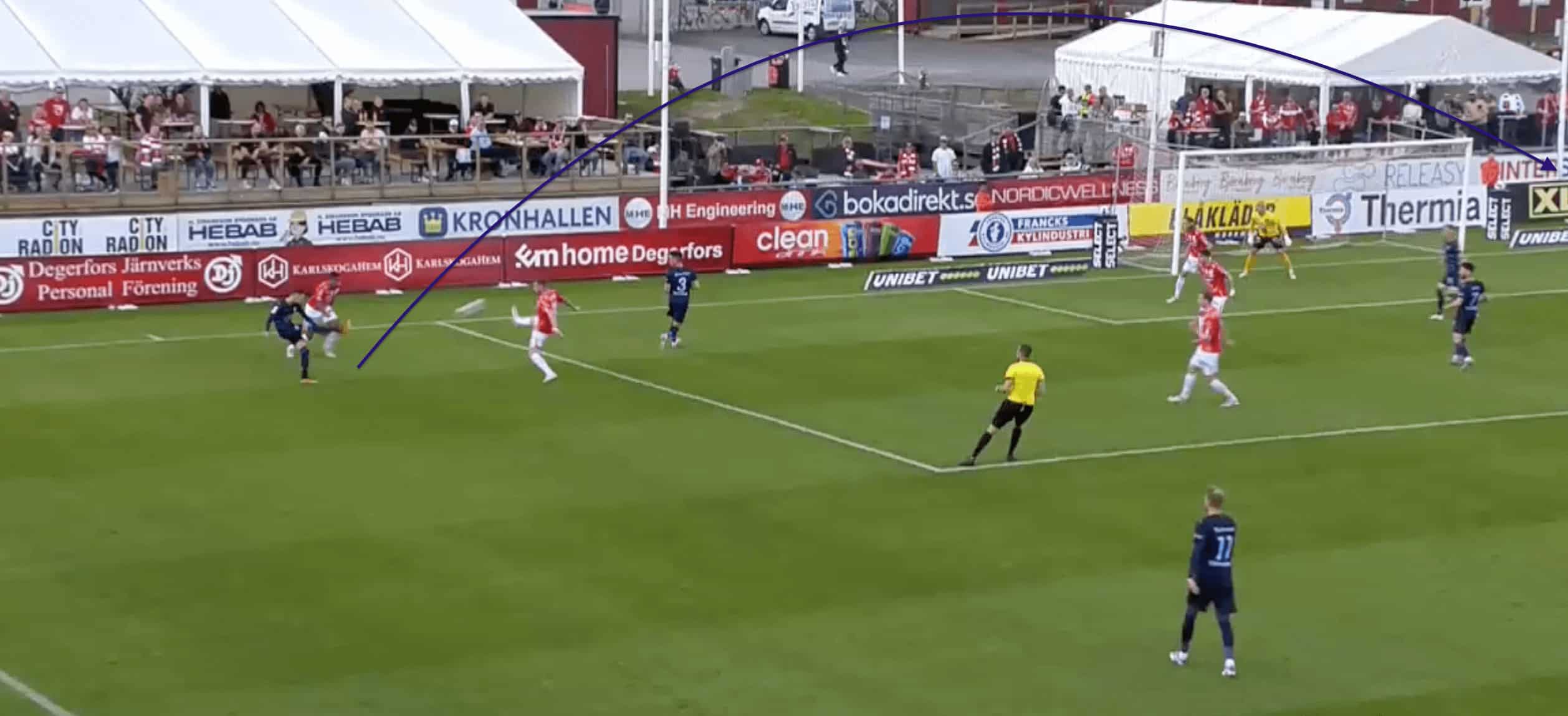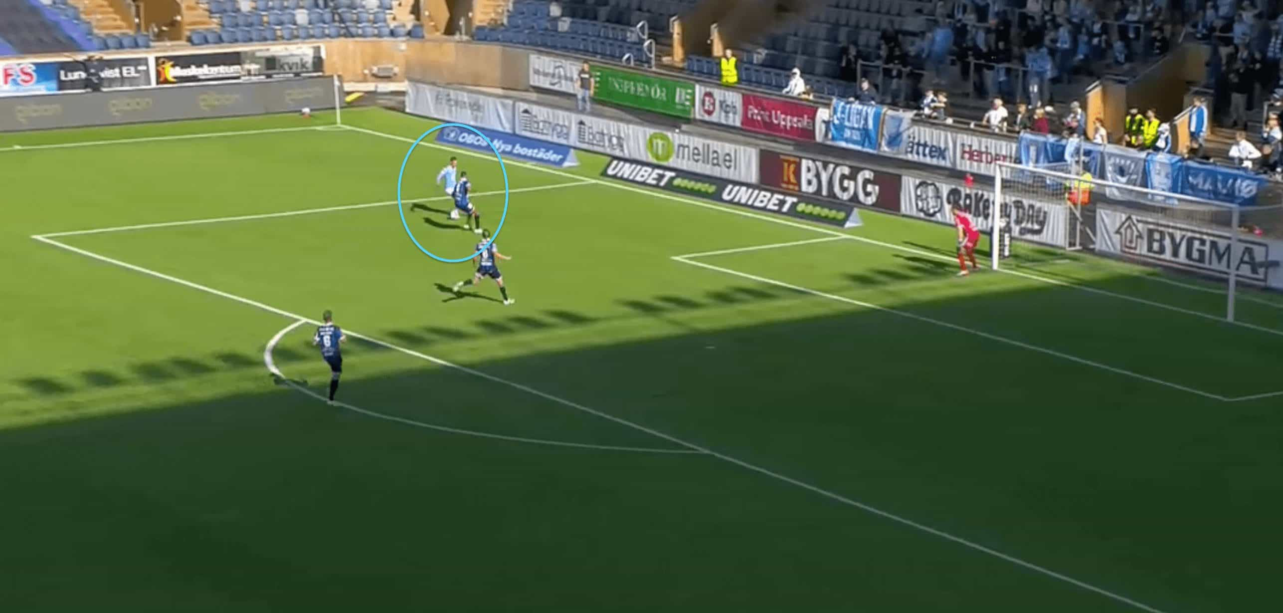 This is another example of him making a run, but this time, the whole opposition defence is very messy, which makes it easy for Malmo to create a good chance out of it and get into the opposition’s final third.