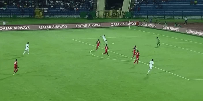 Geubbels shows his pace as the centre forward plays him in behind the backline. Note the distance Geubbels covers in order to get on the end of the through ball.
