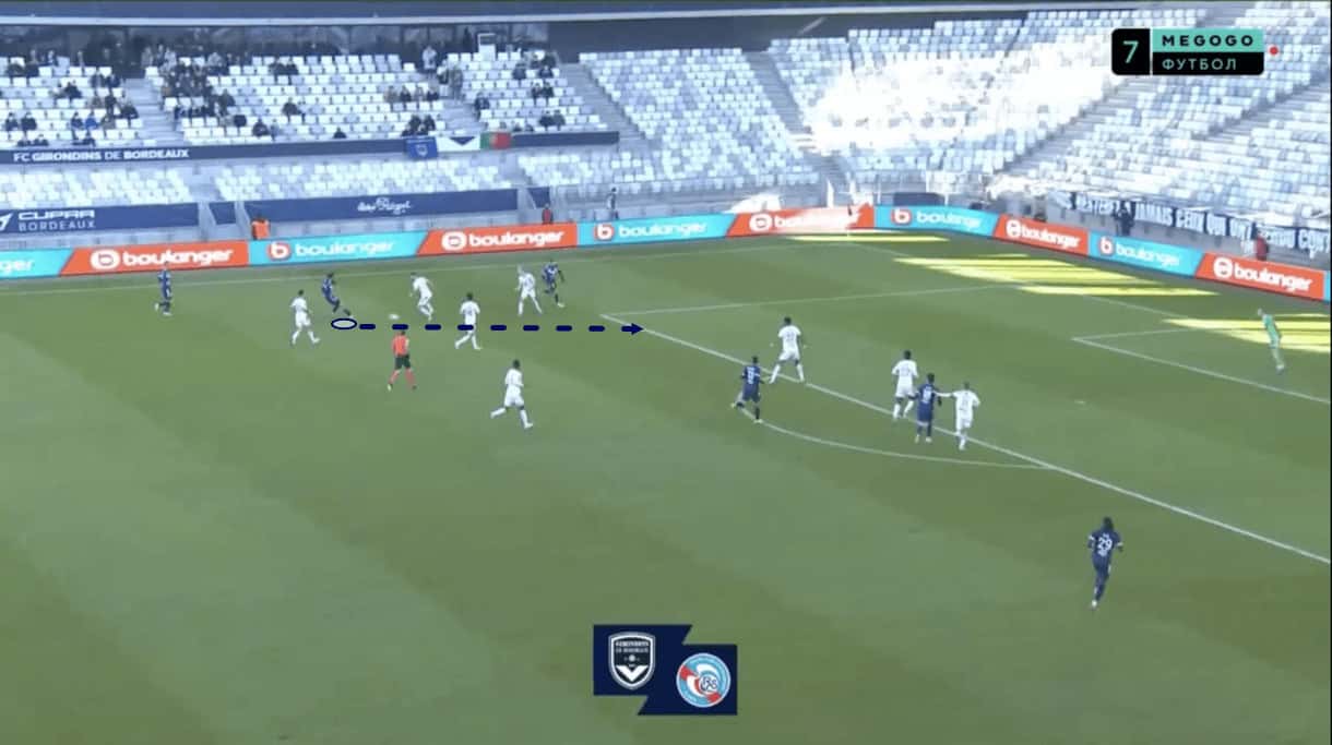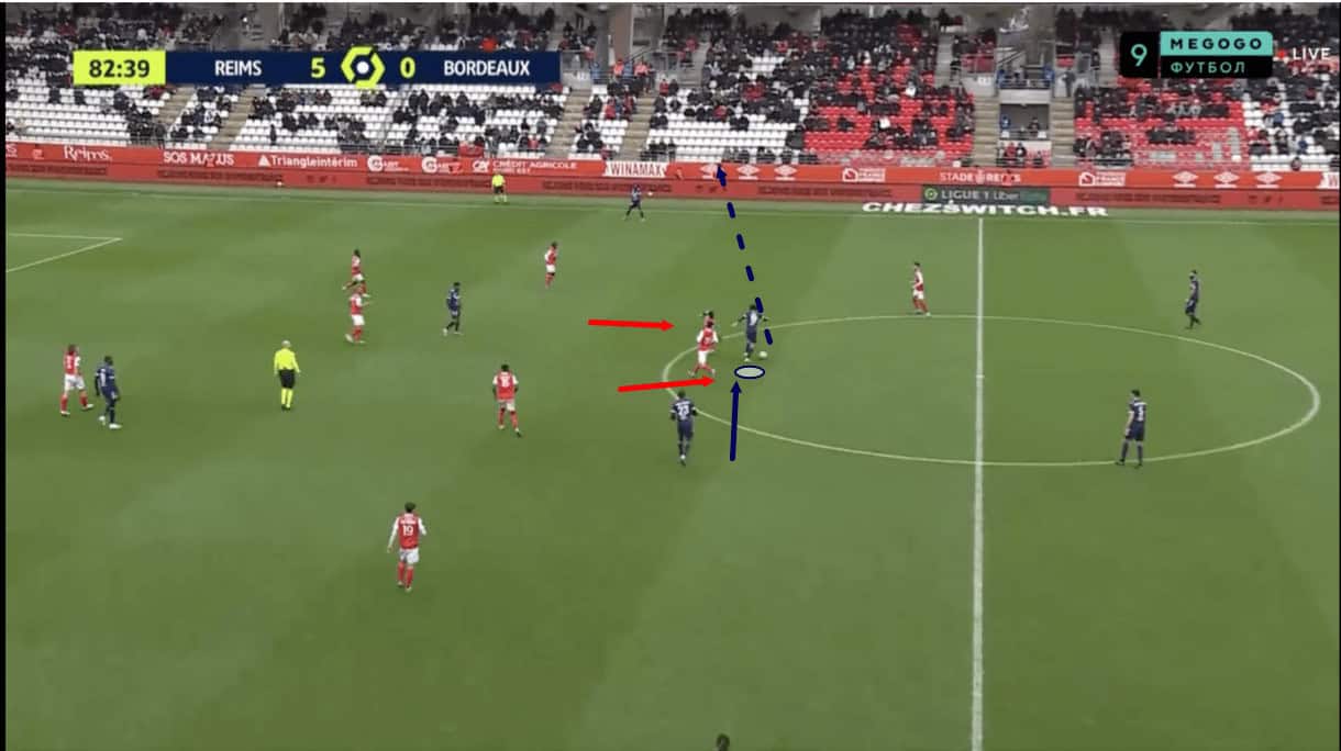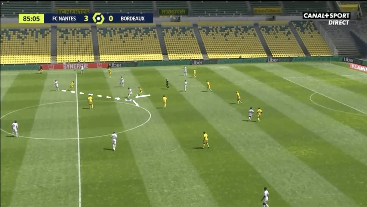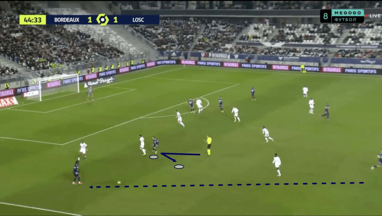 The pitch is far more open at this point and Bordeaux typically don’t build with lots of players packed closeby, resulting in not as many immediate passing options becoming apparent when carrying the ball in deeper areas compared to when carrying the ball in more advanced areas, as seen previously in this scout report.