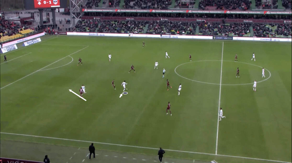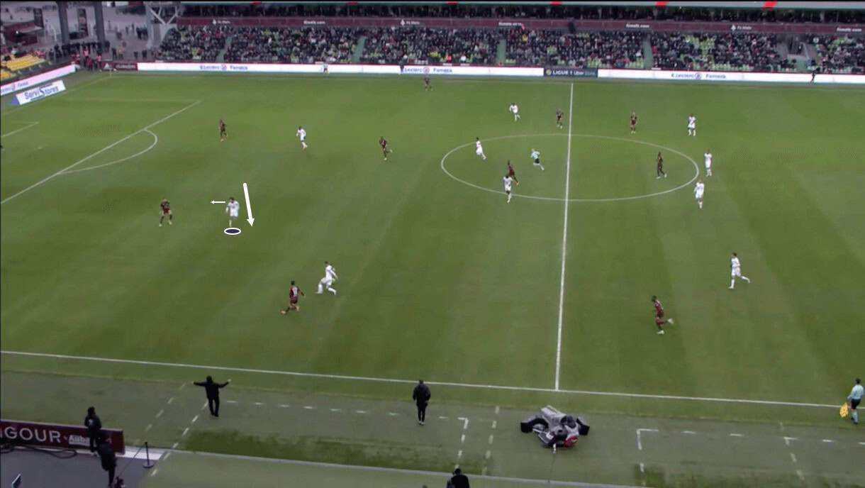 In the image above, Adli dropped deep from his ‘10’ position versus Strasbourg to pick up the ball from his centre-back teammate before quickly turning and driving into the opposition’s half casually with the ball at his feet.