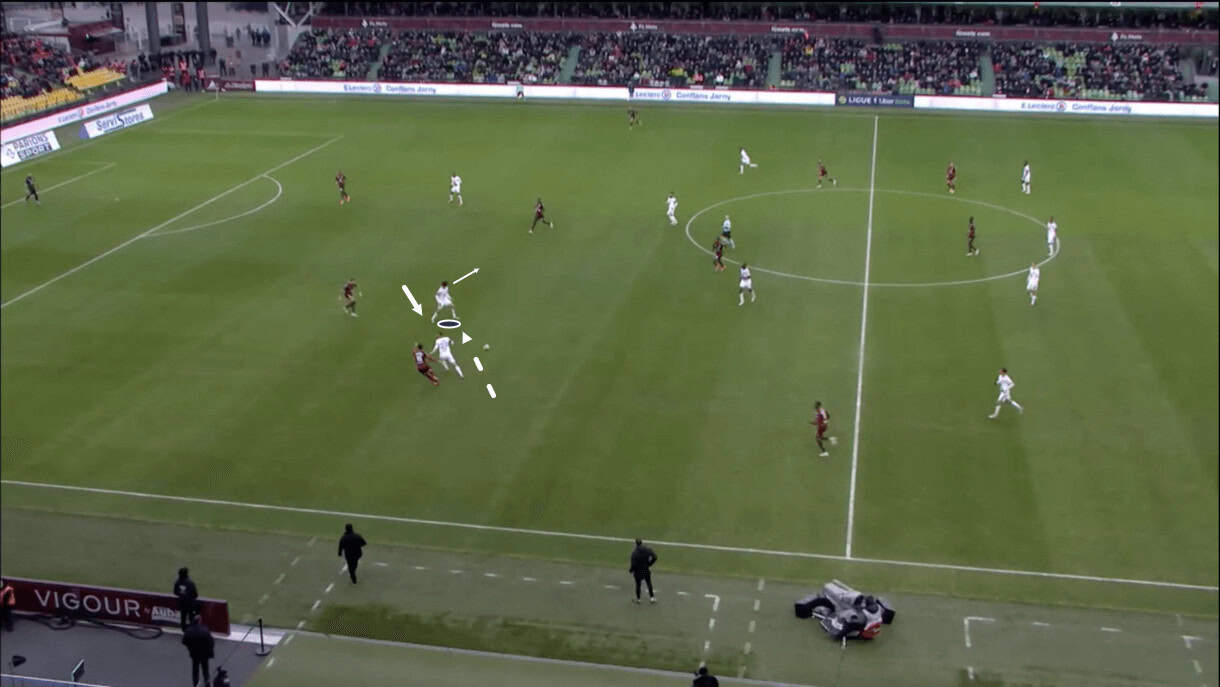 He feels comfortable under pressure and enjoys creating additional space for teammates via his dribble, while he also loves to fire through balls to the runners from this position, which is why he’s played 2.79 through passes per 90 this term, per Wyscout — the fifth-most of any Ligue 1 central midfielder/attacking midfielder to have played at least 500 minutes in 2021/22.