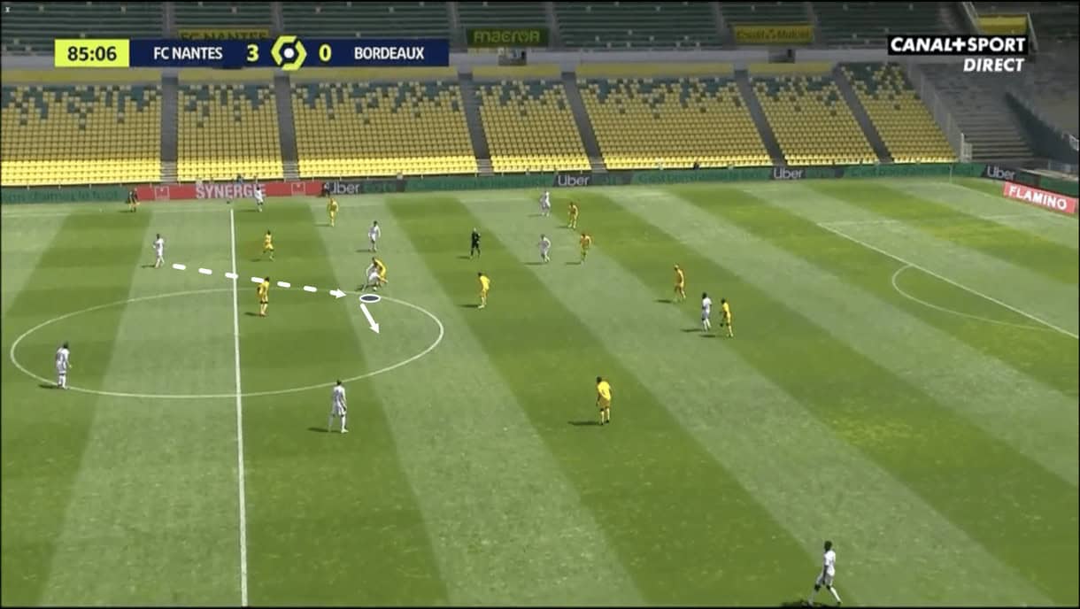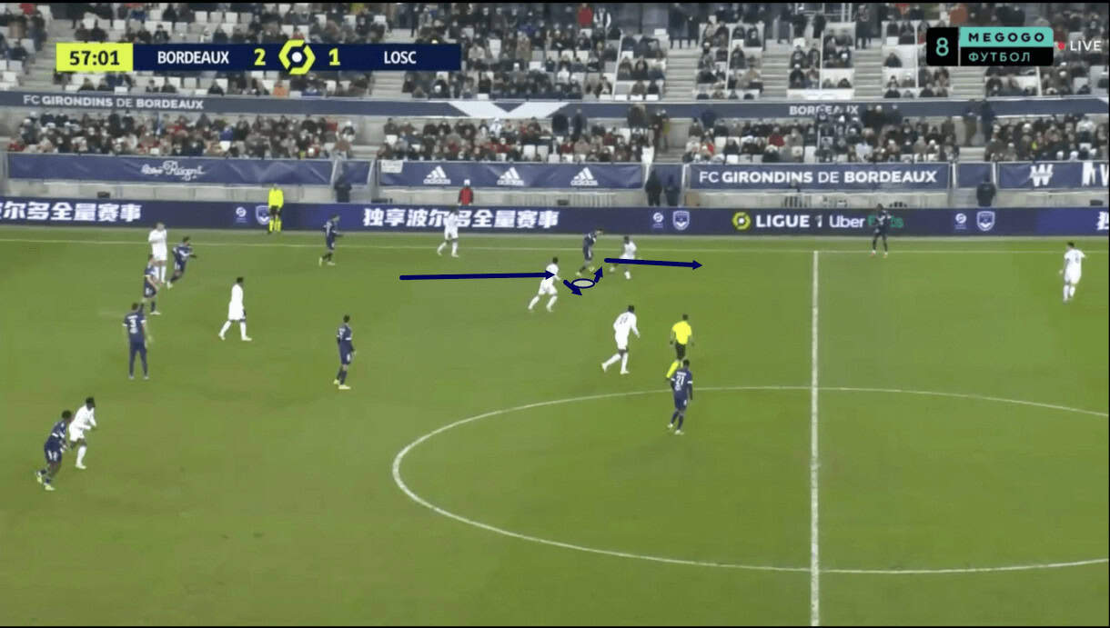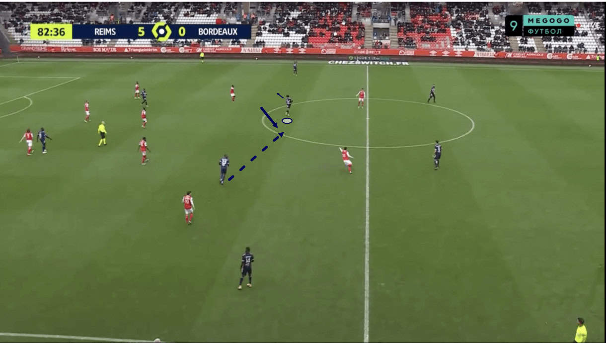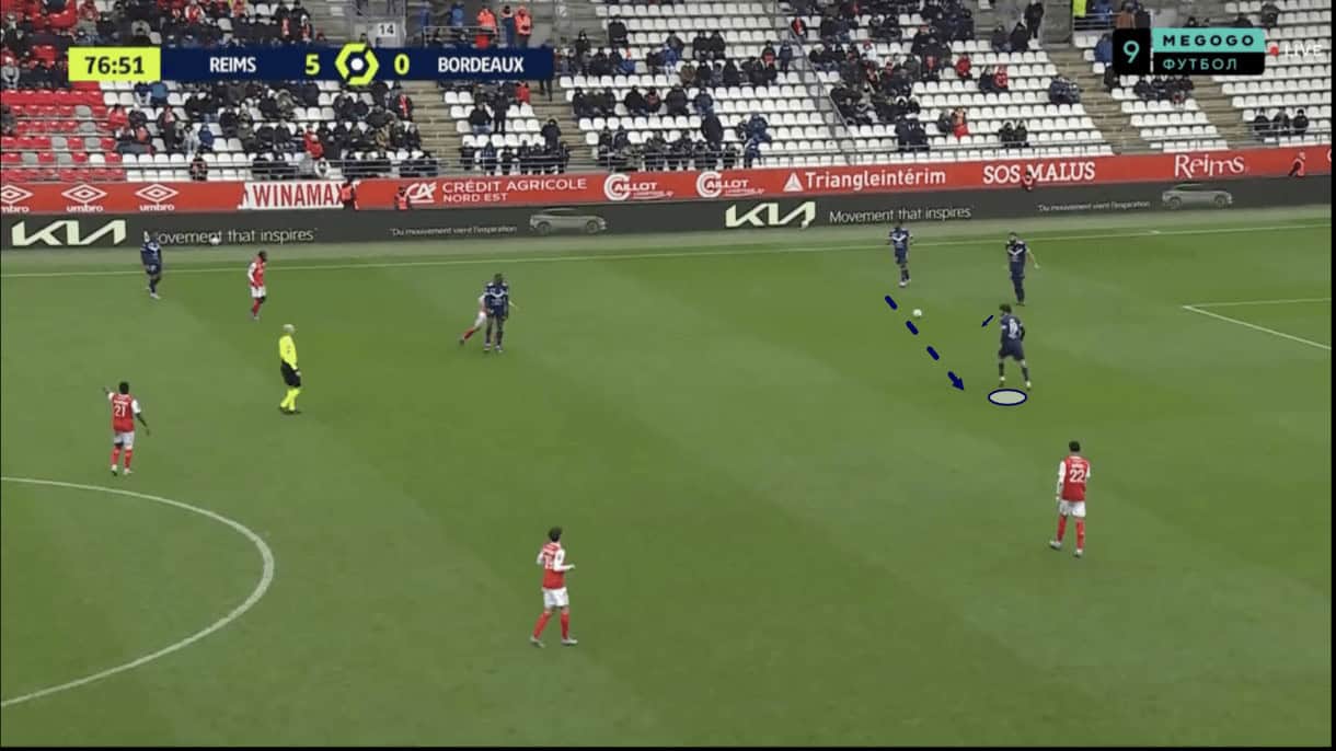 The Bordeaux player receives well here, again taking the ball on the half-turn, quickly reorientating himself to face the business end of the pitch and then starts driving forward with the ball, as we see in figure 11.
