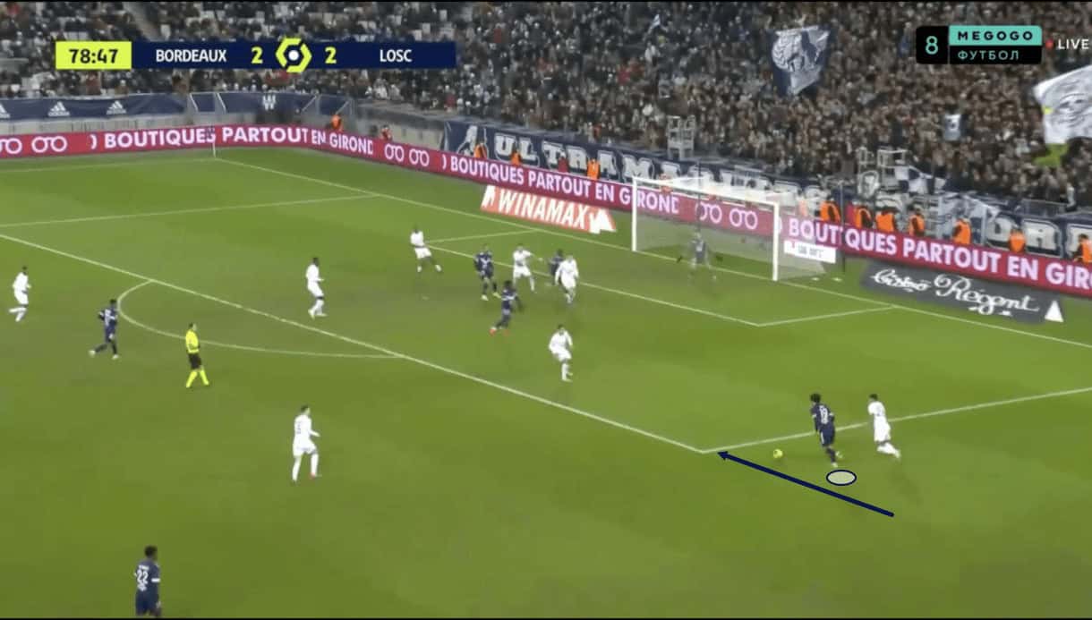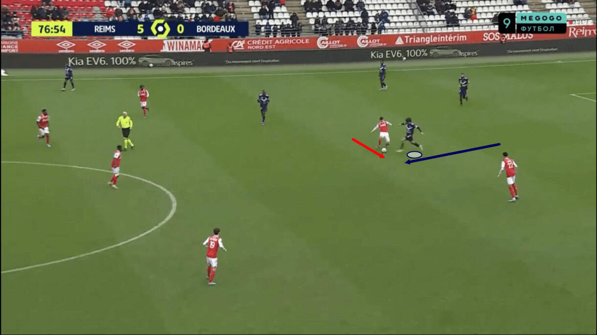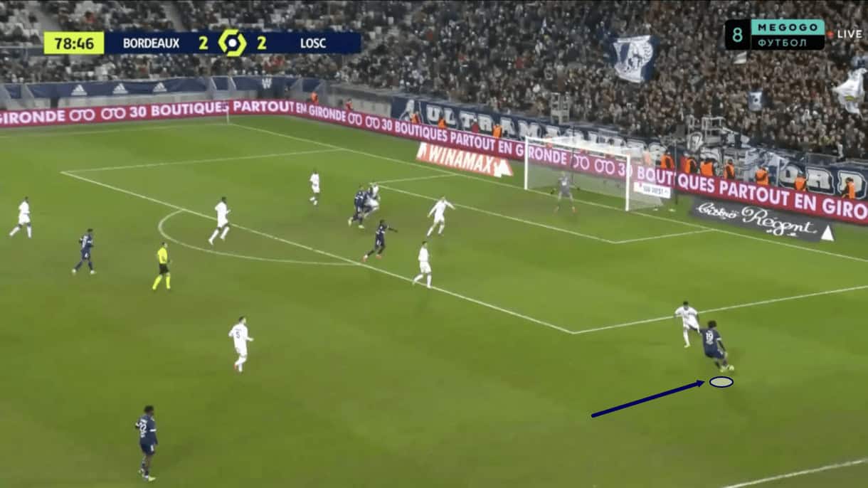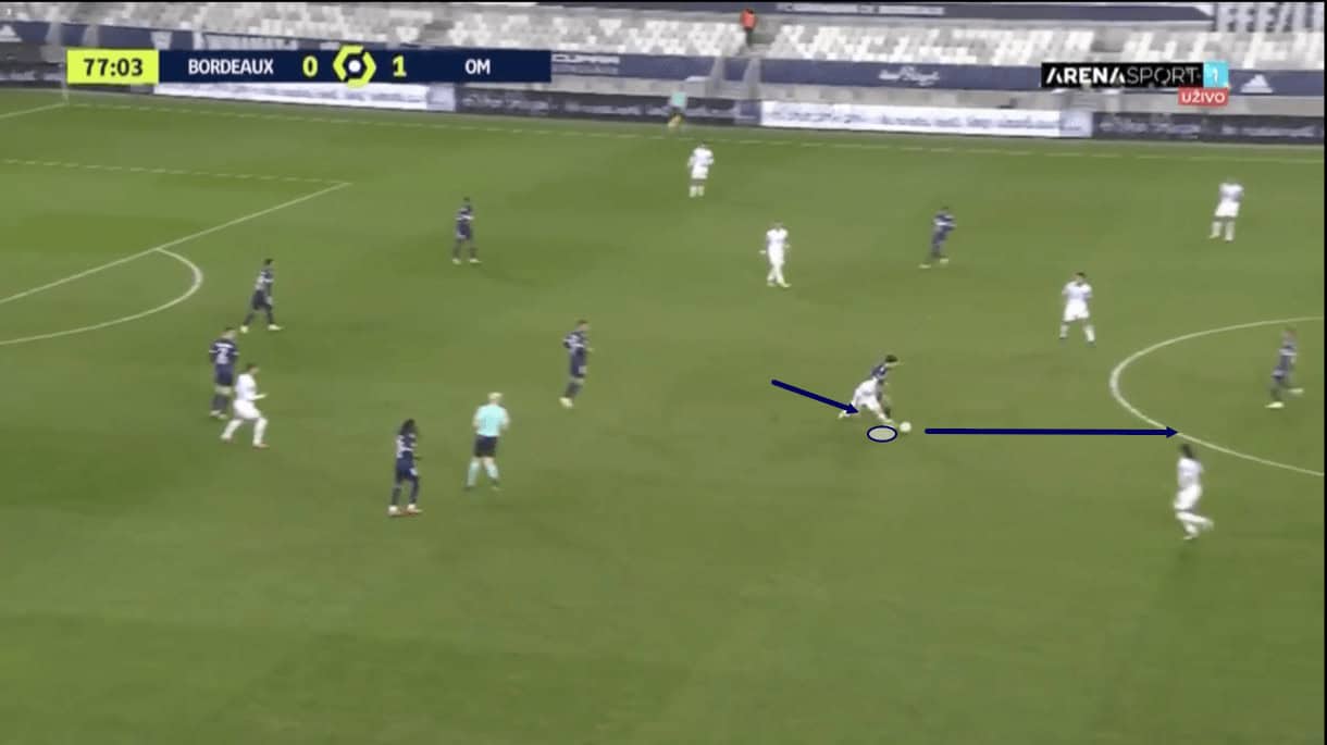 The Bordeaux player receives well here, again taking the ball on the half-turn, quickly reorientating himself to face the business end of the pitch and then starts driving forward with the ball, as we see in figure 11.